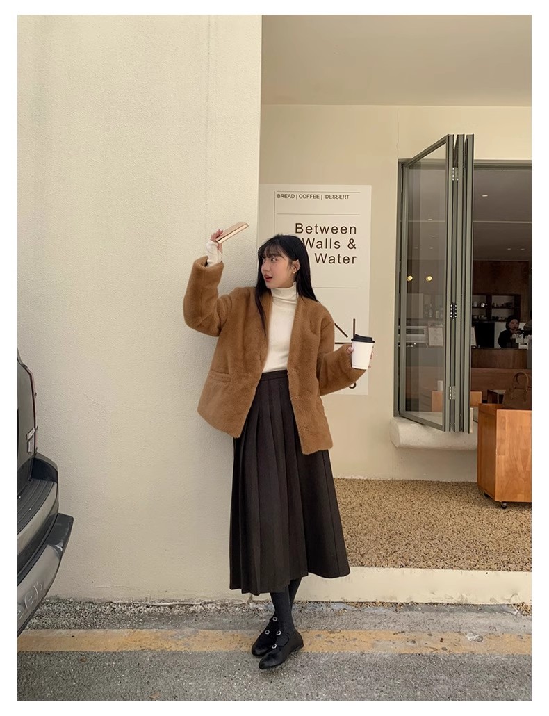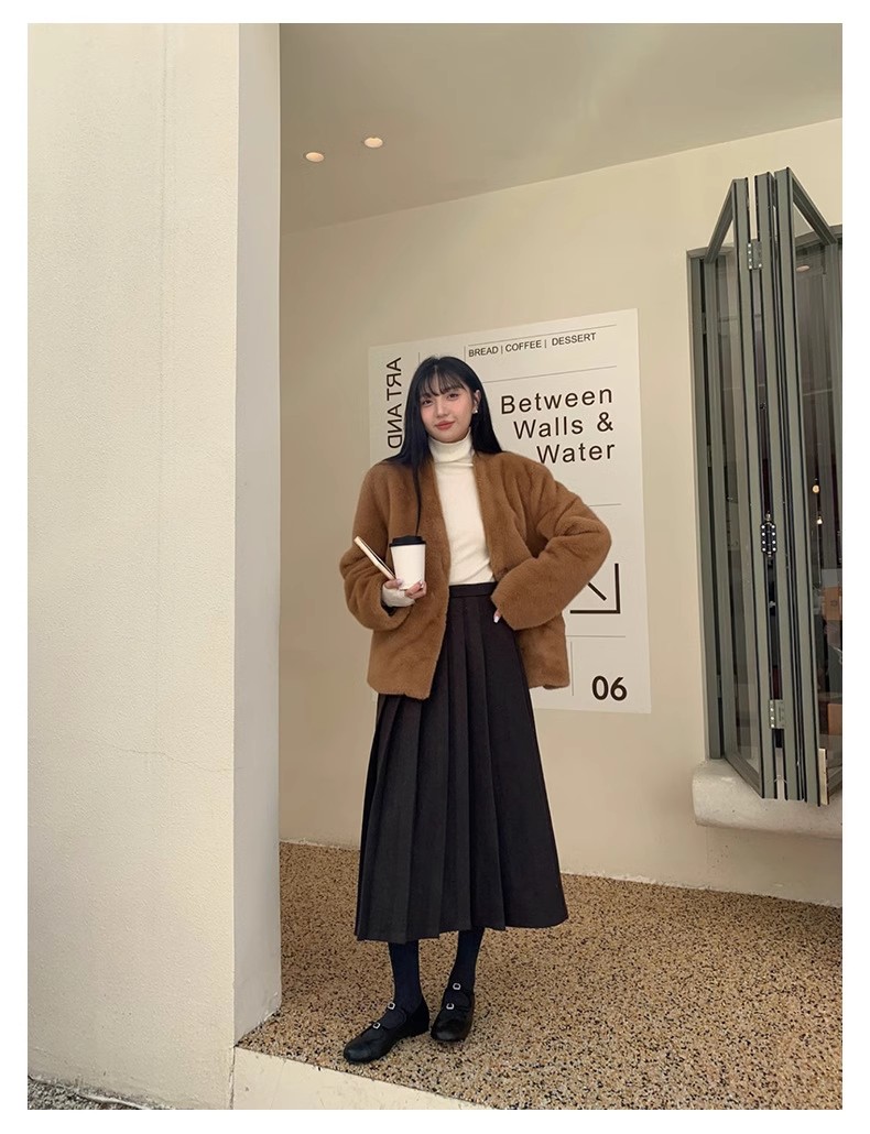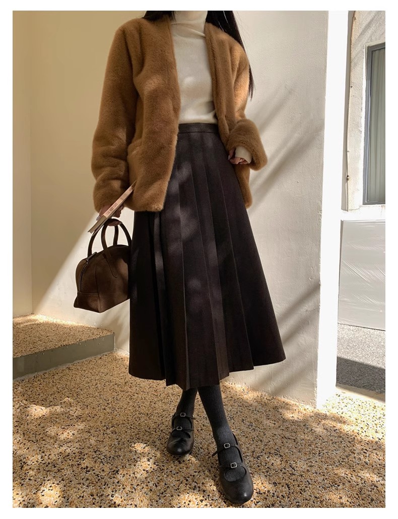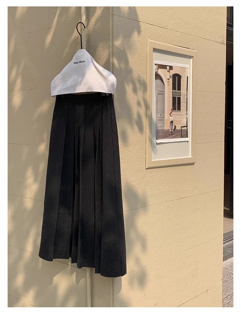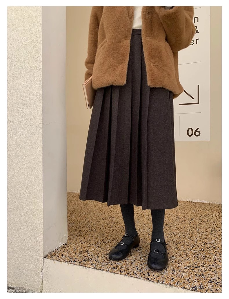 冬季新款毛呢复古半身百褶裙休闲慵懒风中长款显瘦高腰A字裙