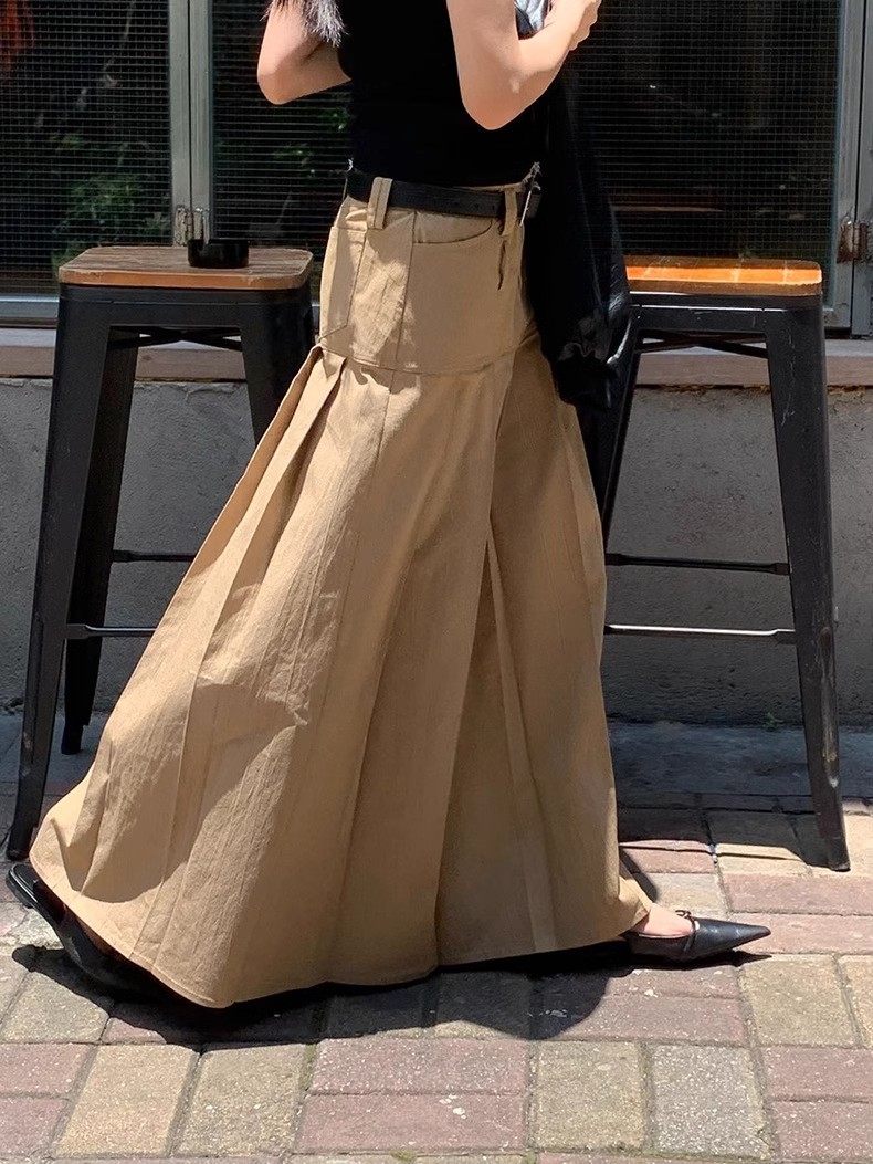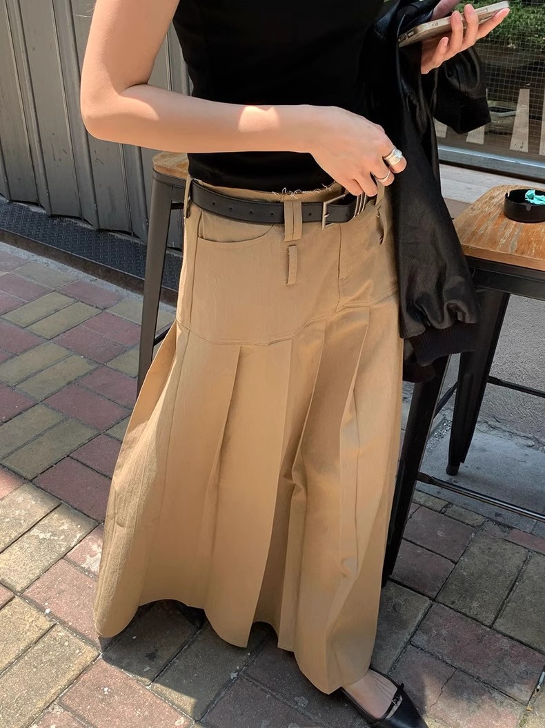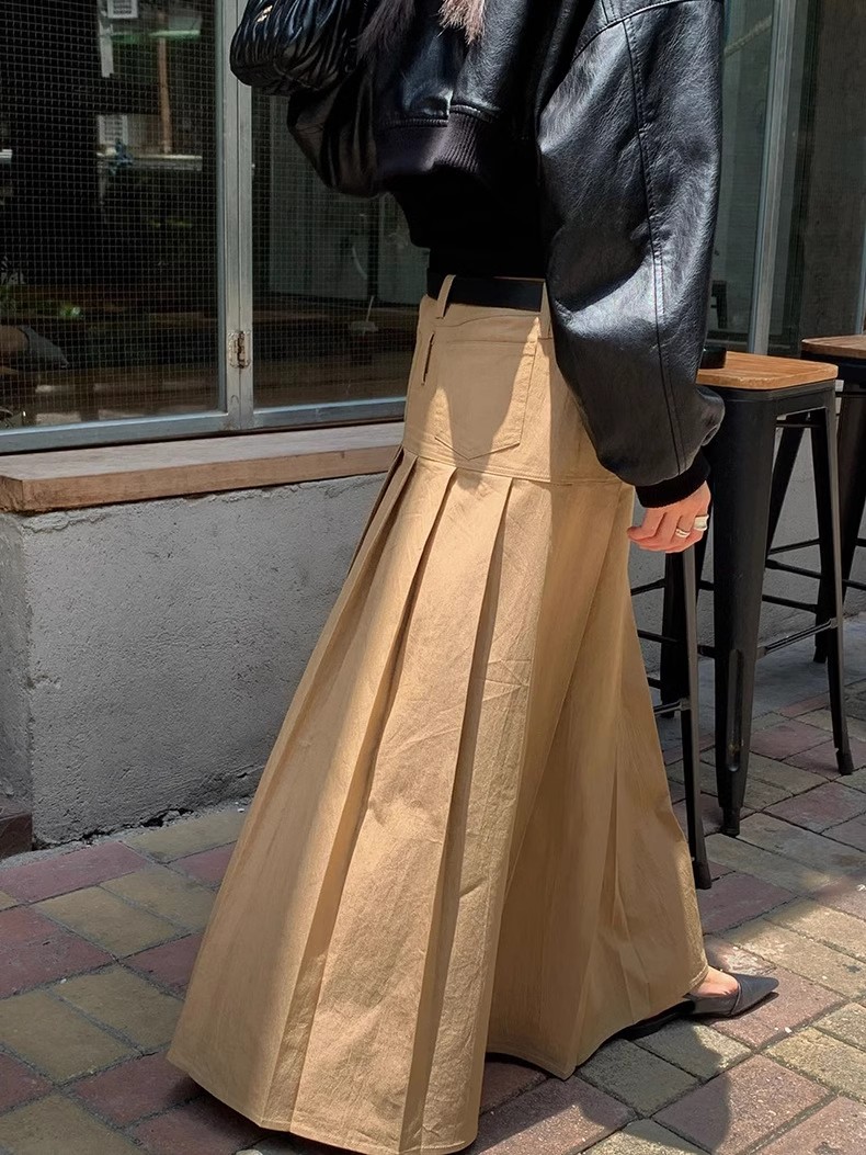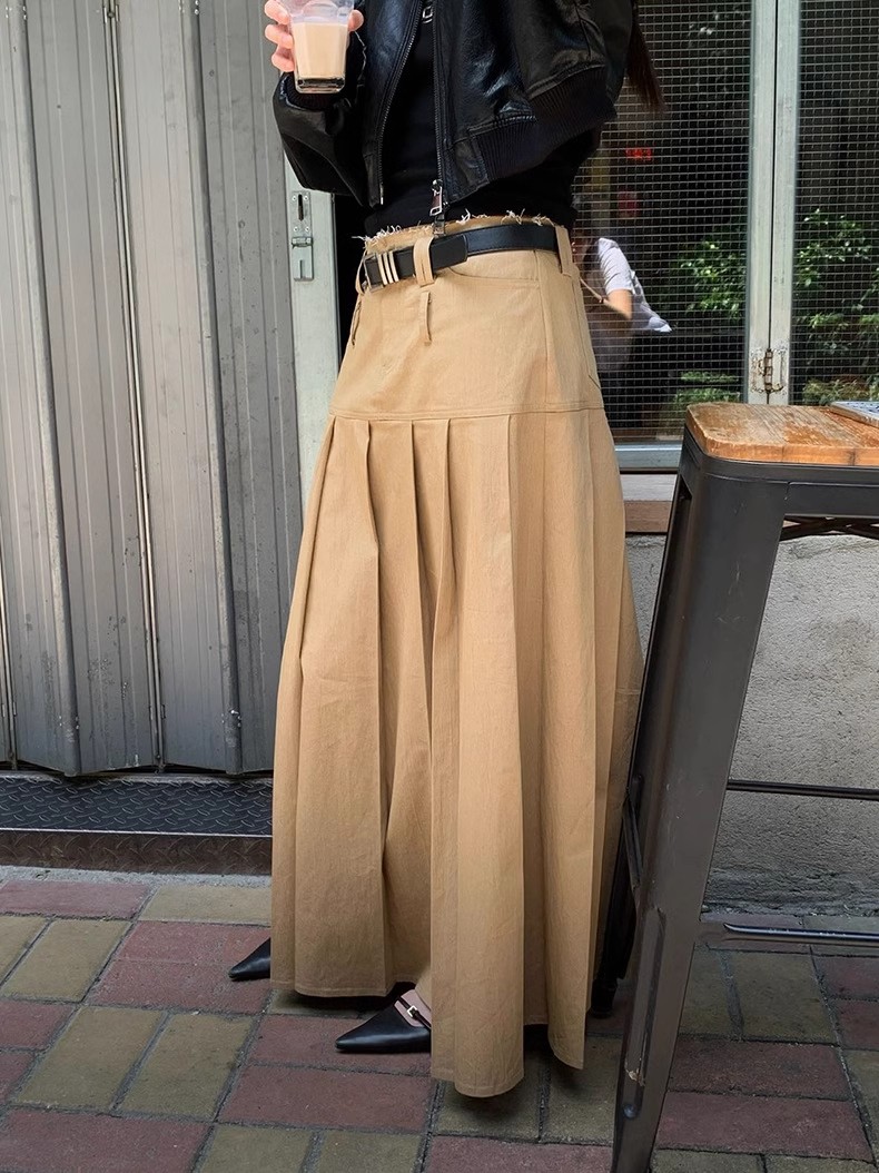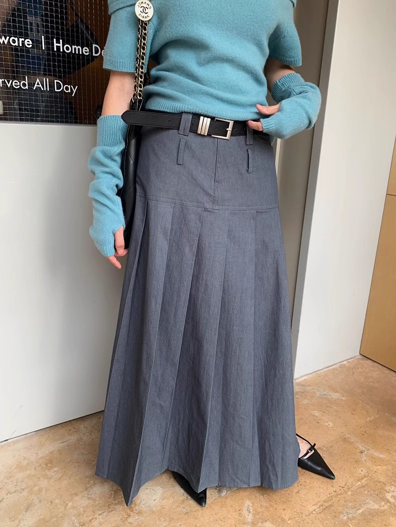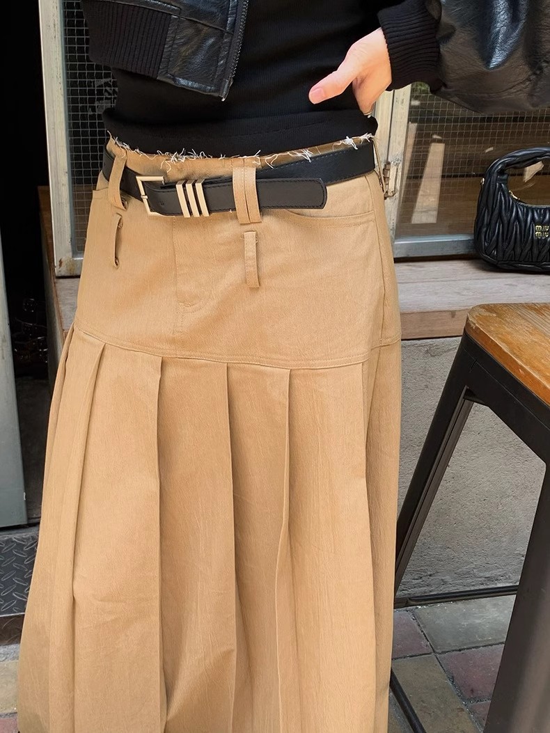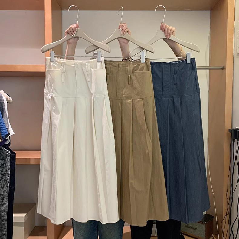 秋季新款韩版休闲通勤款纯色设计感高腰百褶大摆中长款半身裙