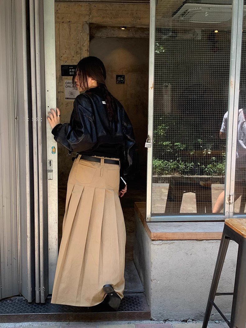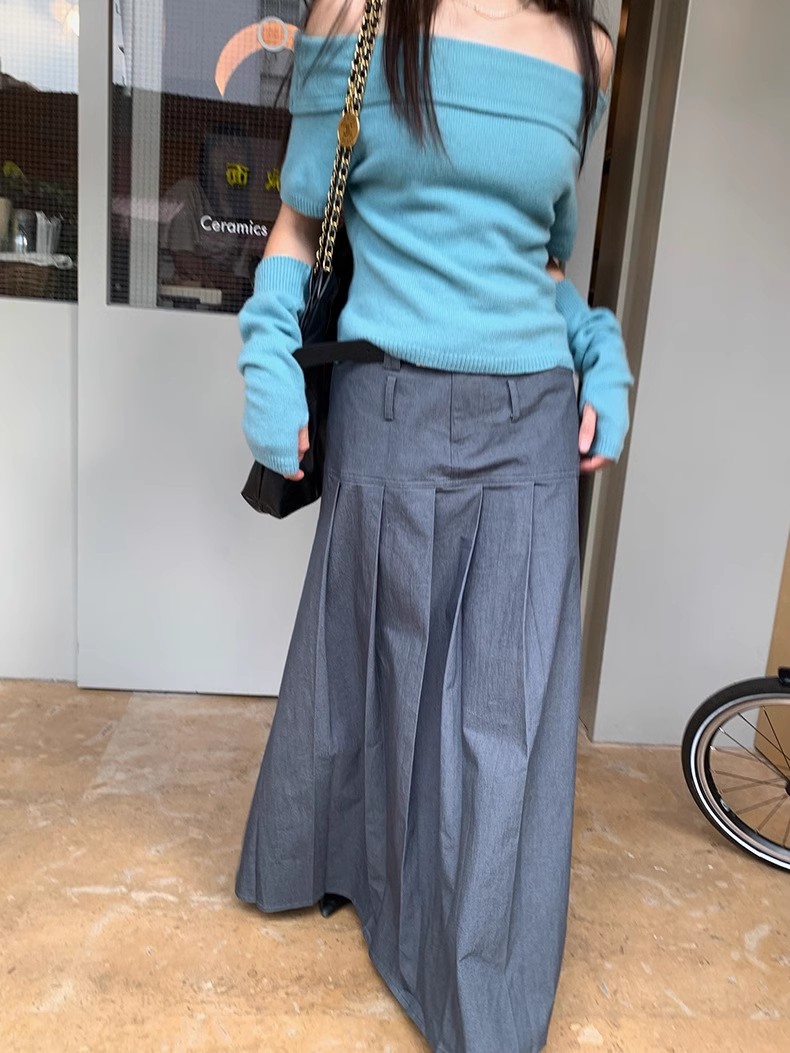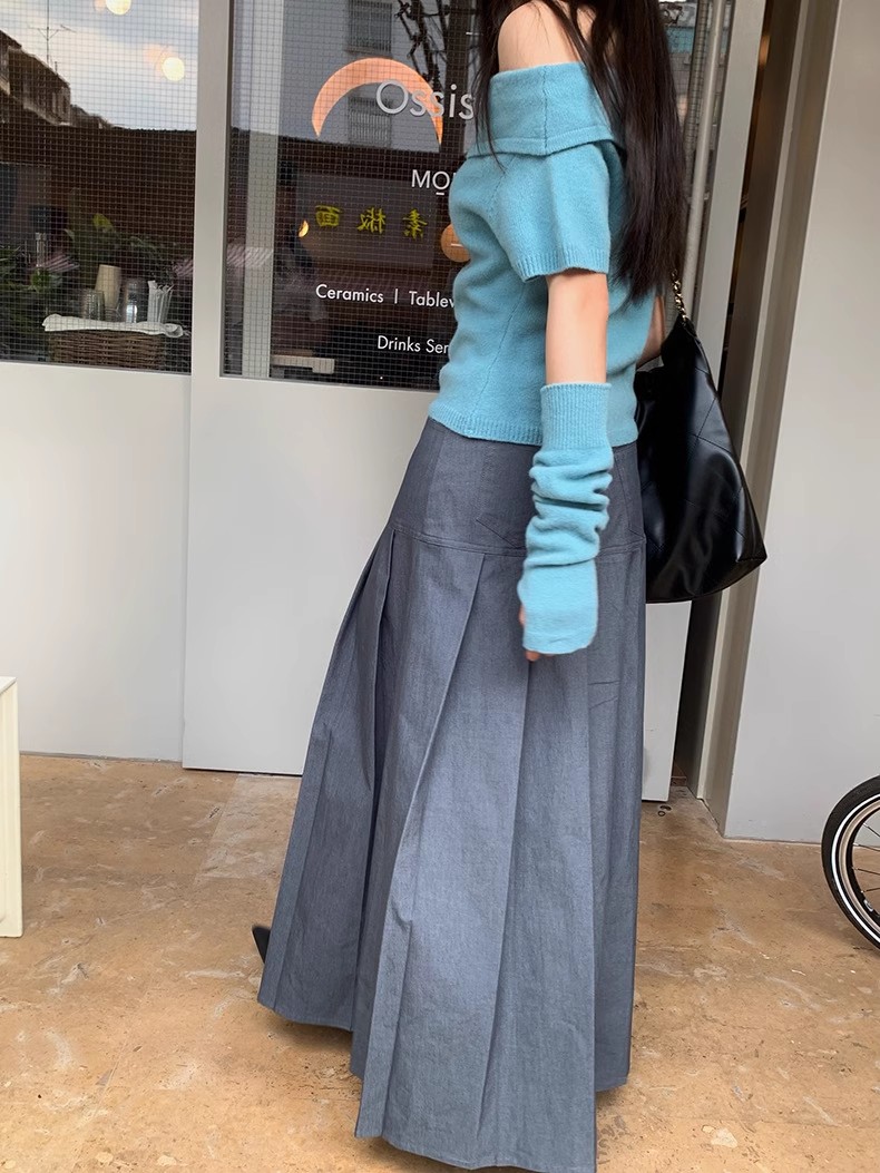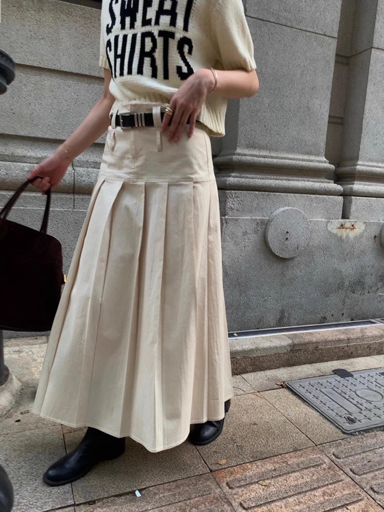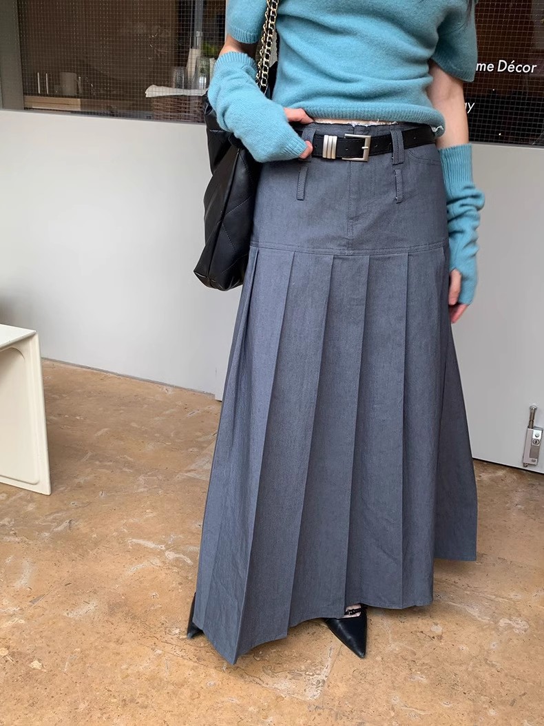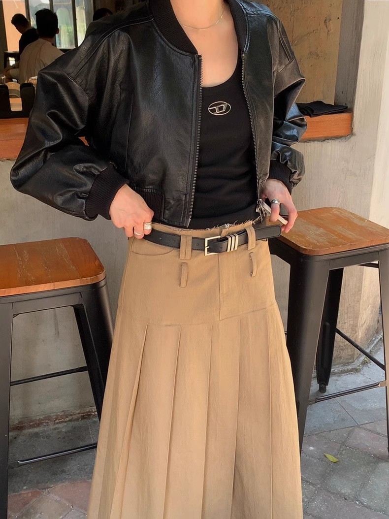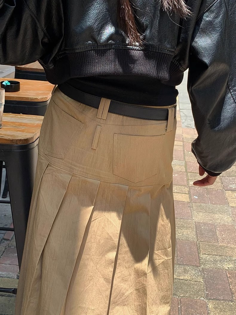 秋季新款韩版休闲通勤款纯色设计感高腰百褶大摆中长款半身裙