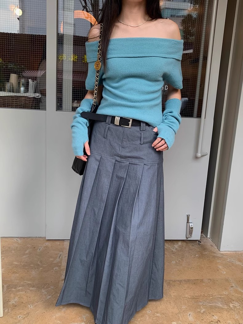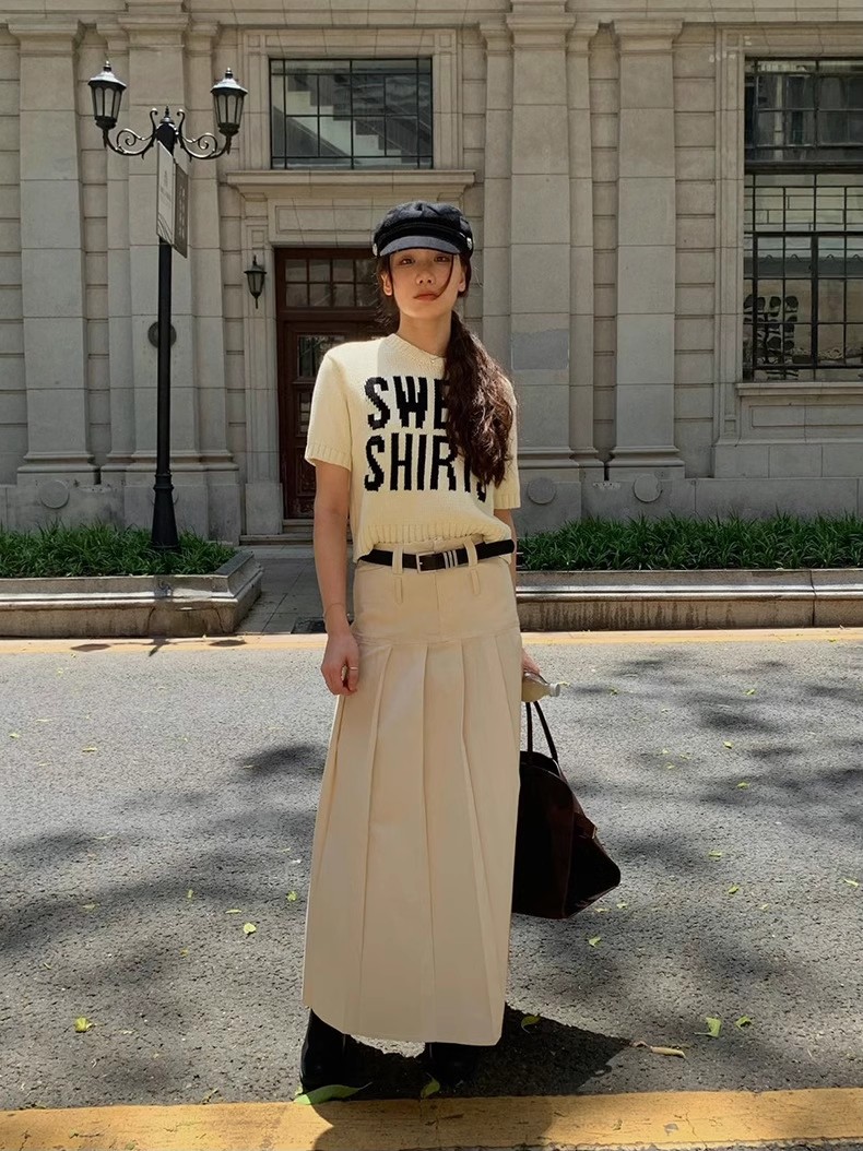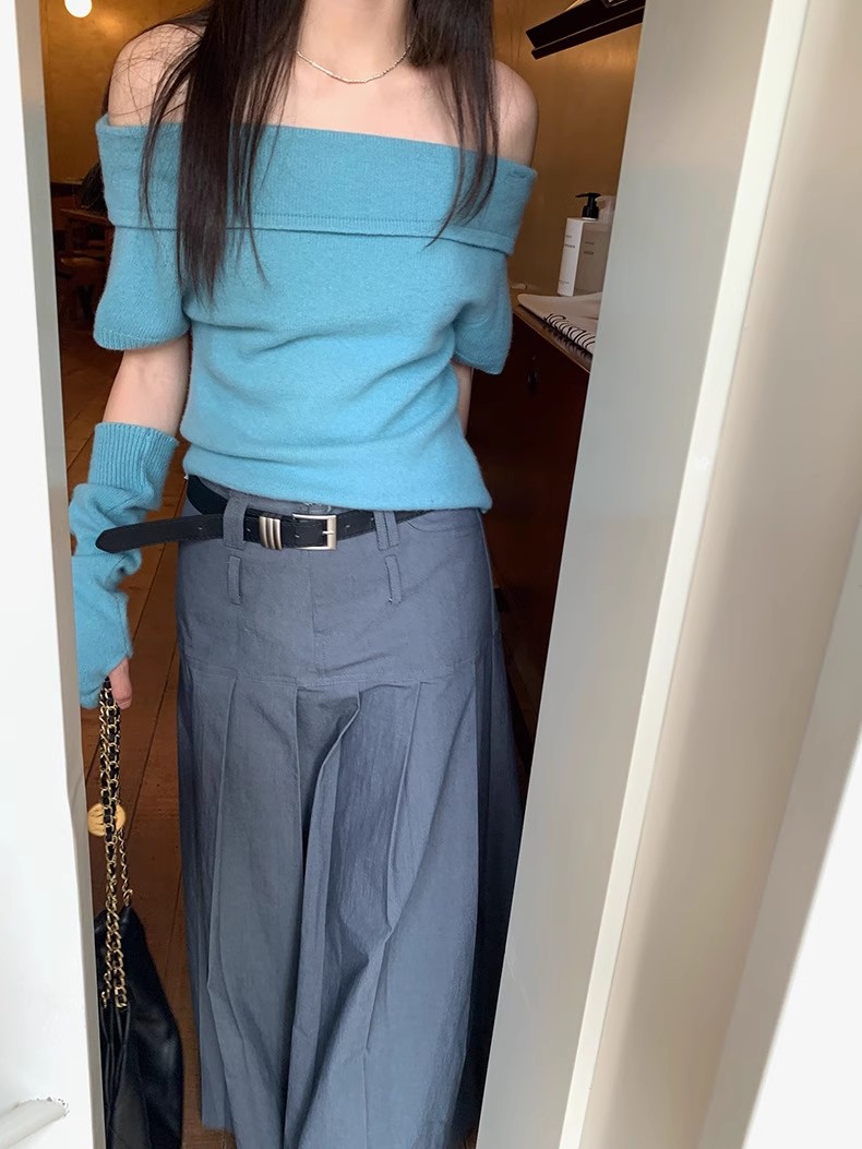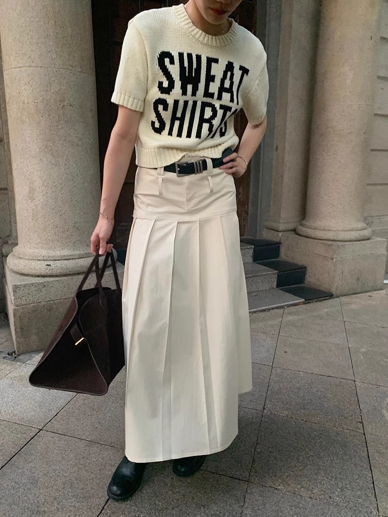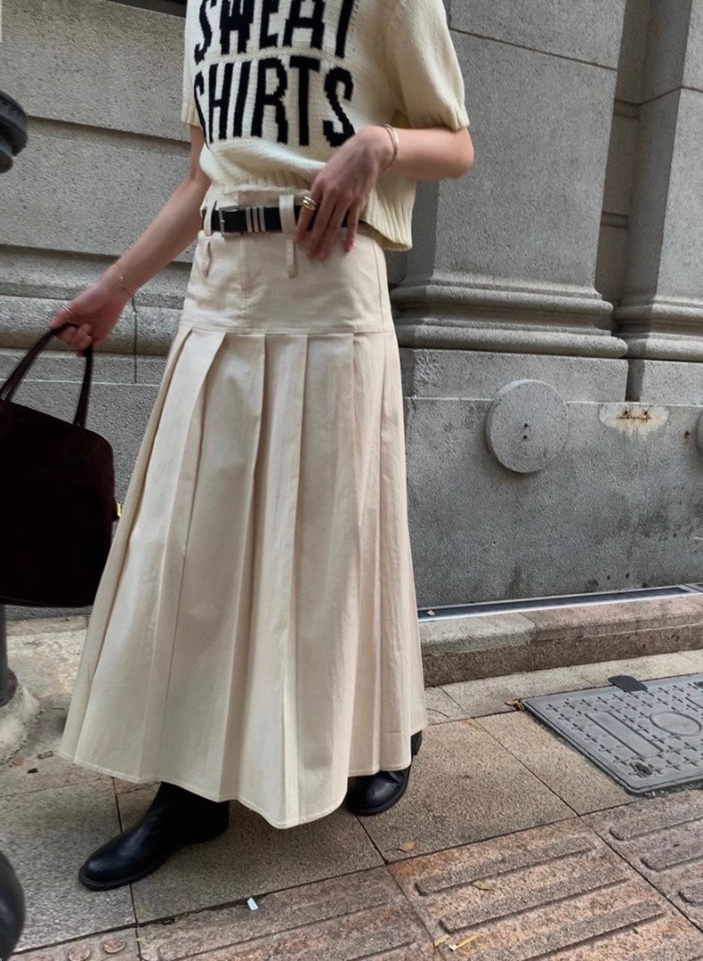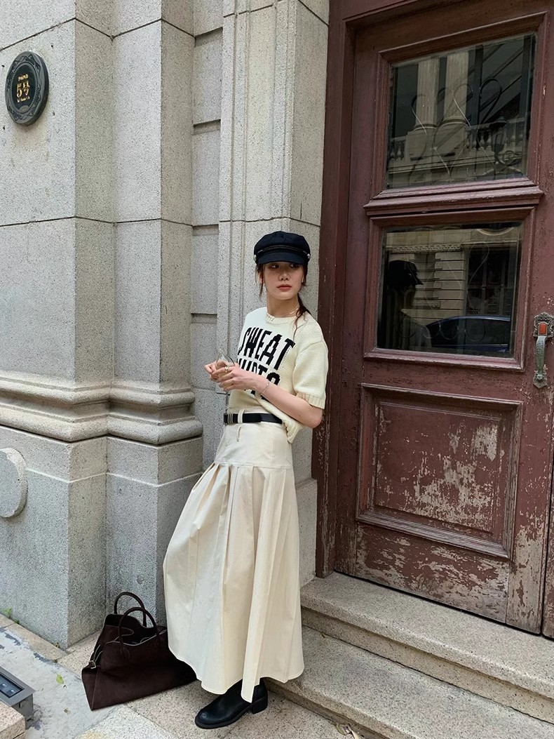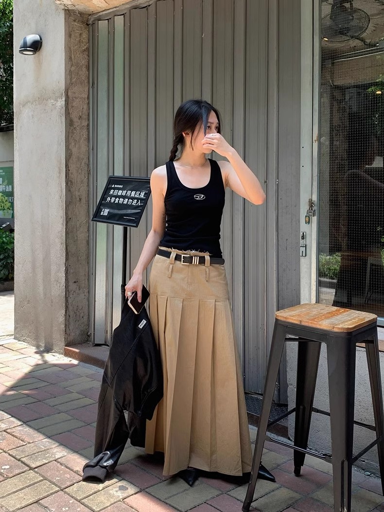秋季新款韩版休闲通勤款纯色设计感高腰百褶大摆中长款半身裙