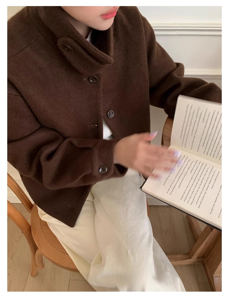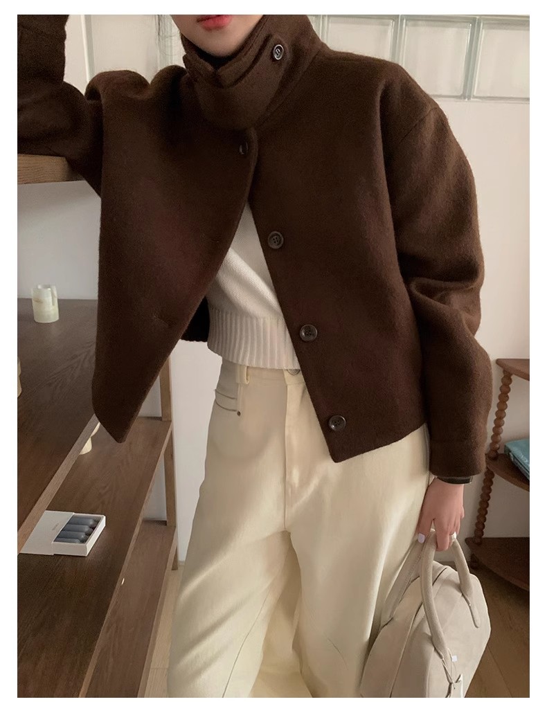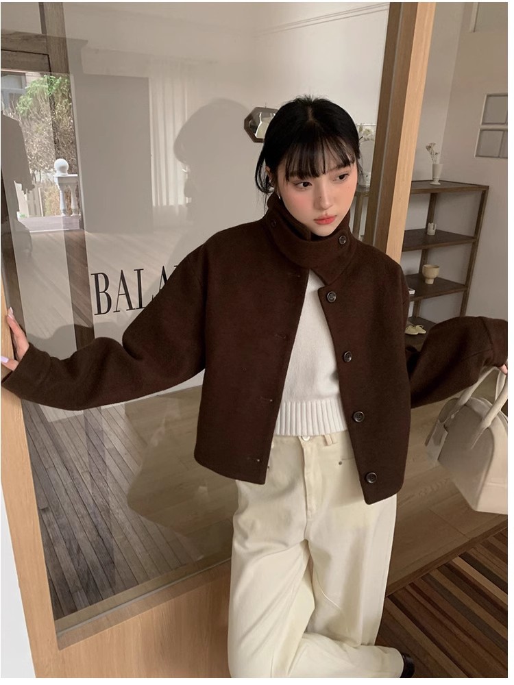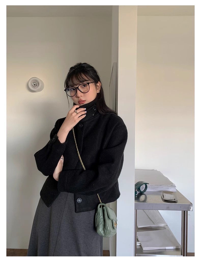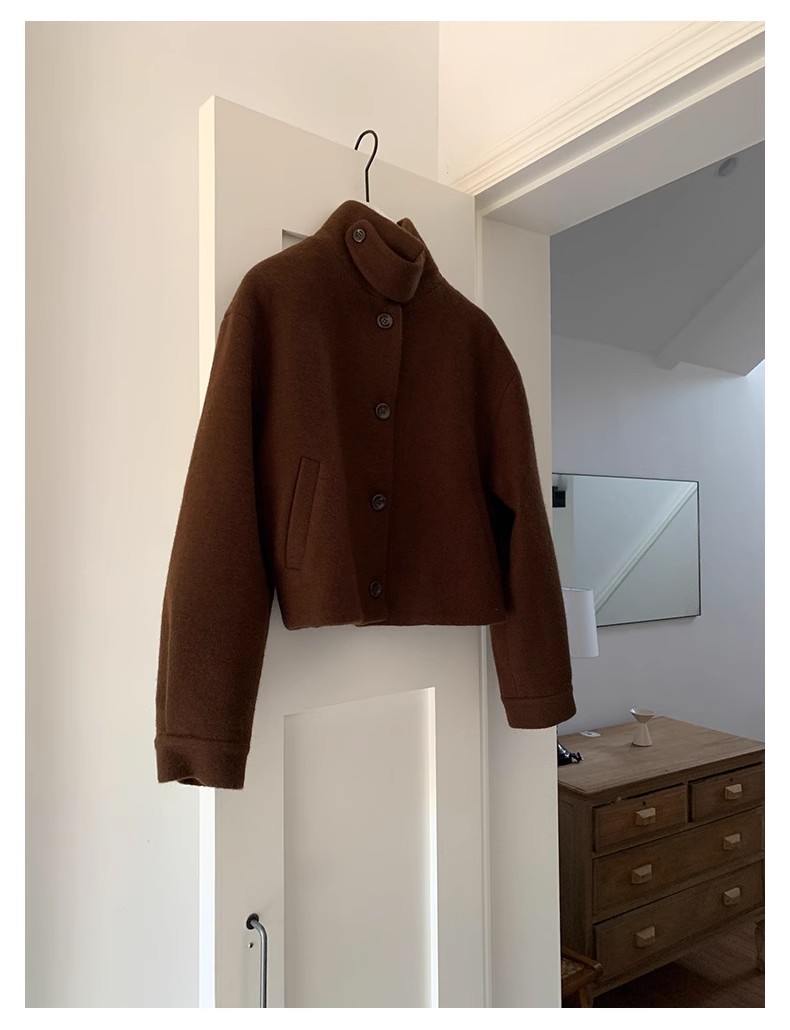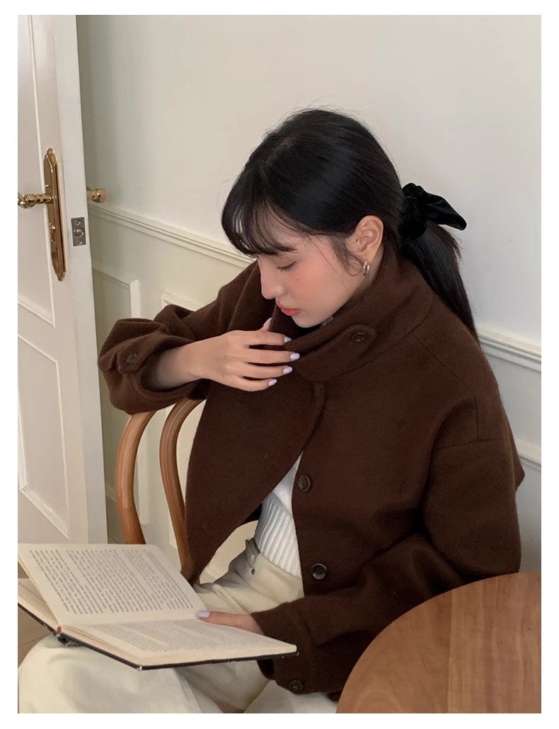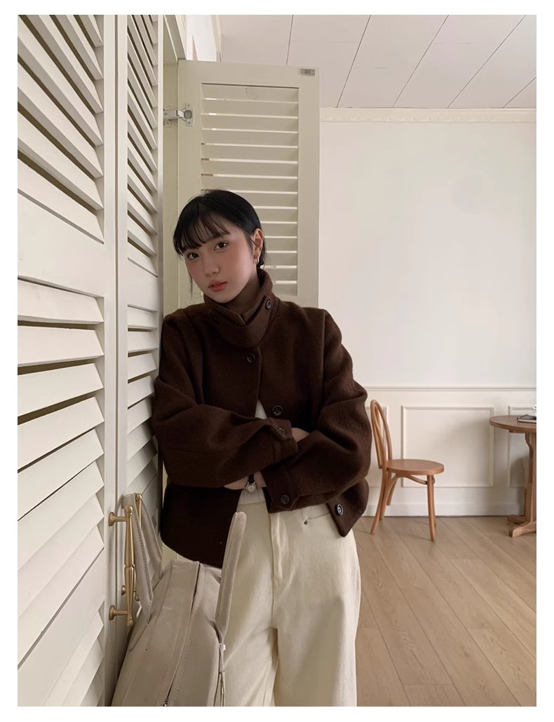 冬季新款系扣立领休闲气质短款大衣美拉德复古挺阔毛呢外套