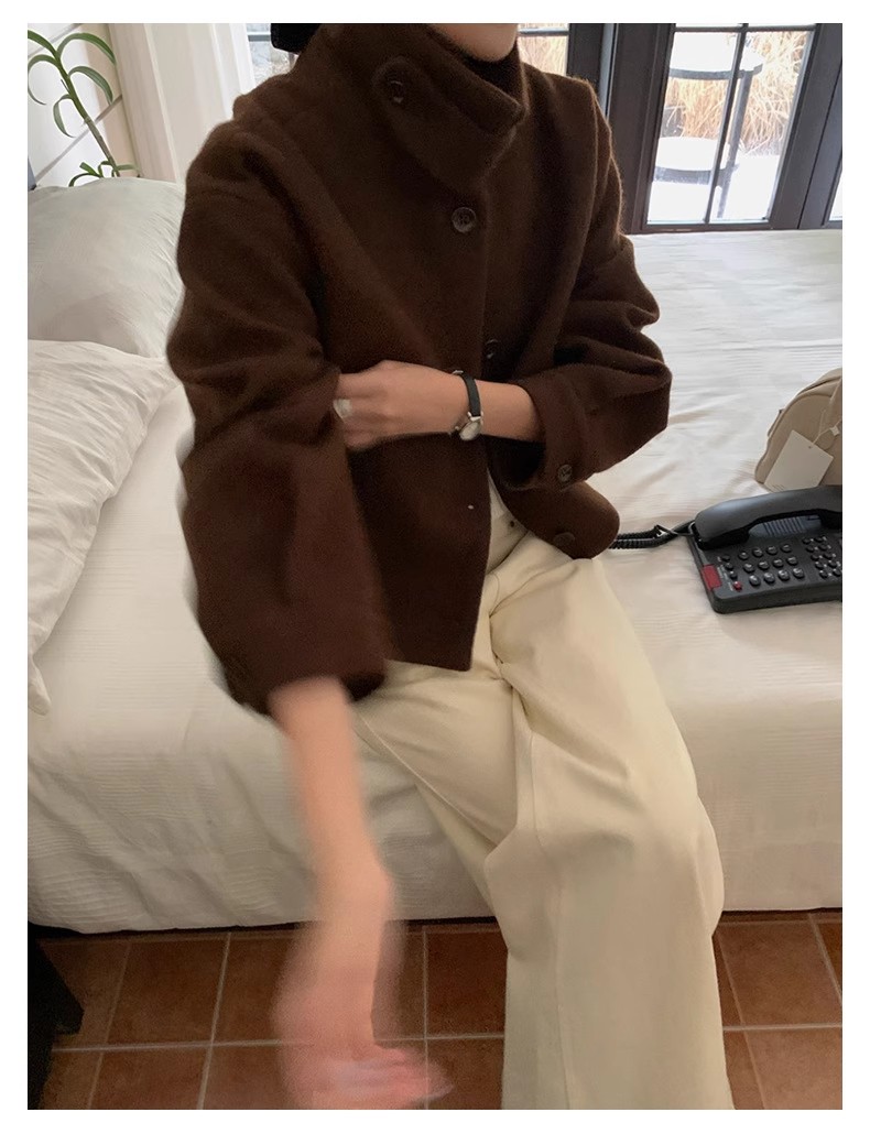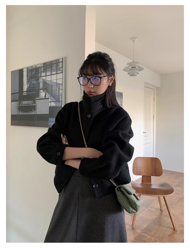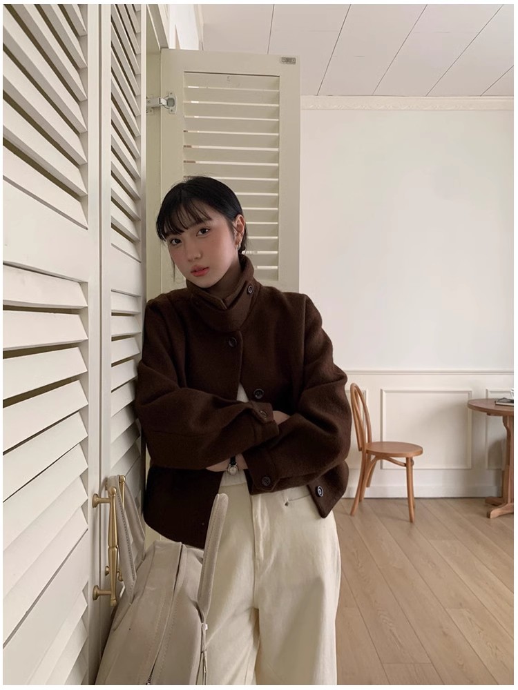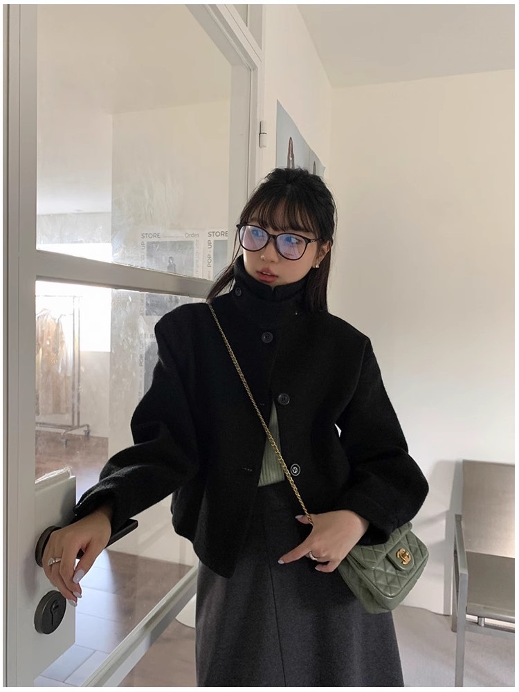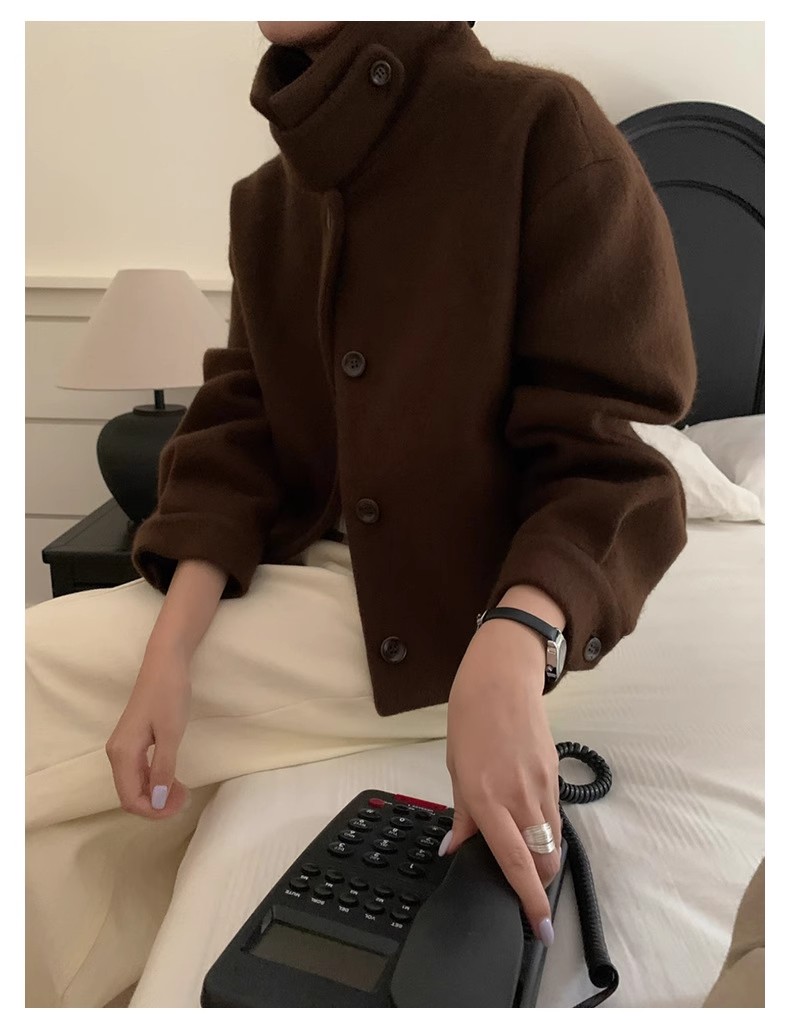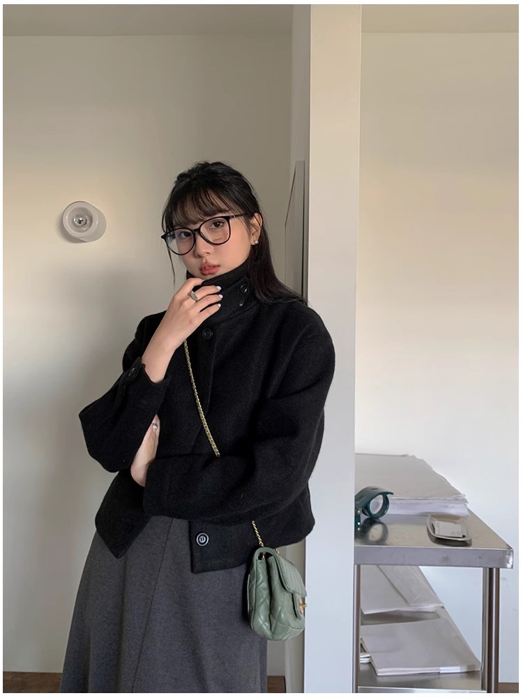 冬季新款系扣立领休闲气质短款大衣美拉德复古挺阔毛呢外套