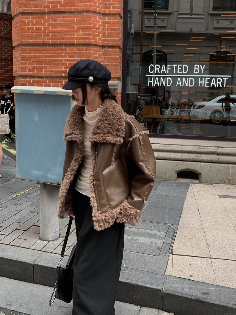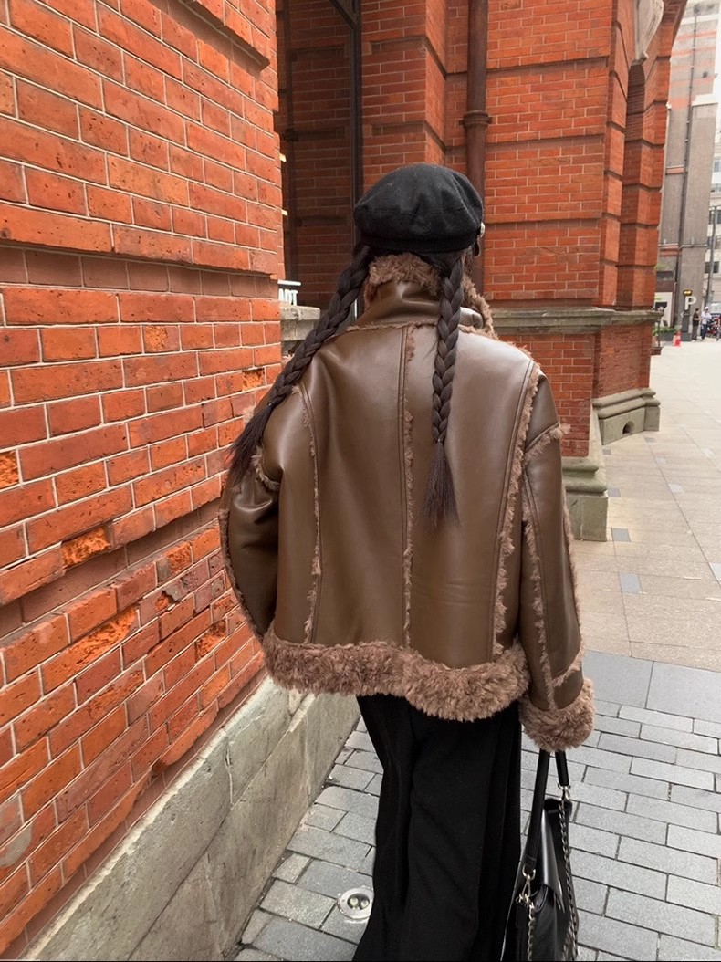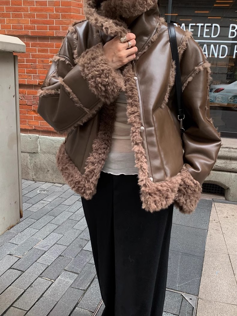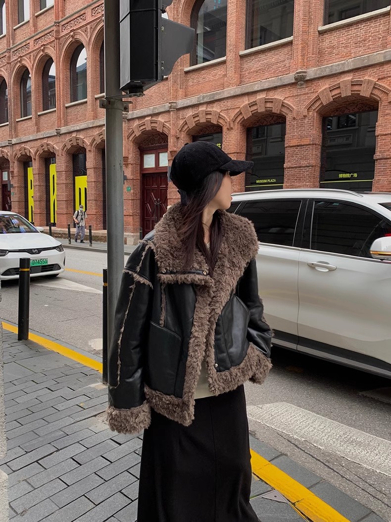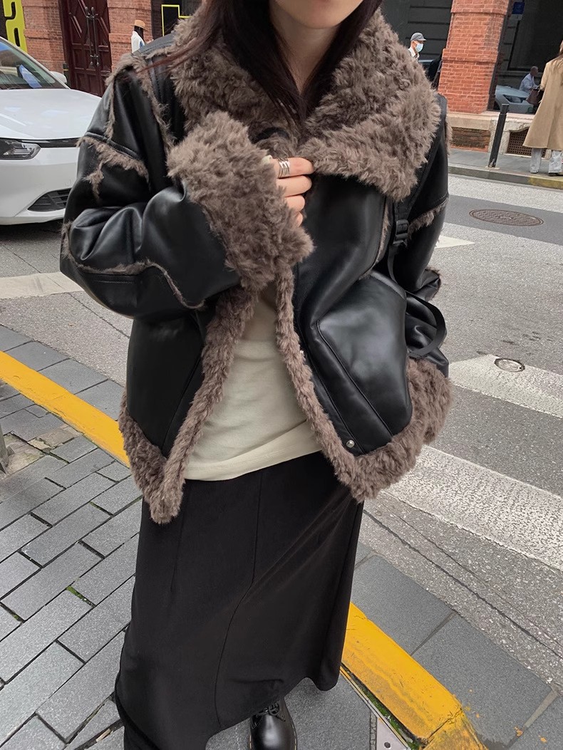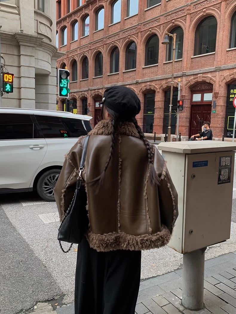 冬季新款复古休闲机车风翻领保暖慵懒皮毛一体宽松短款外套
