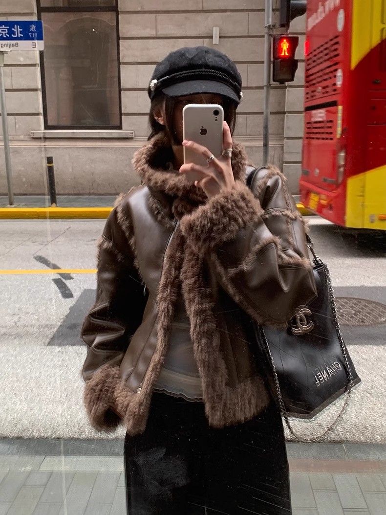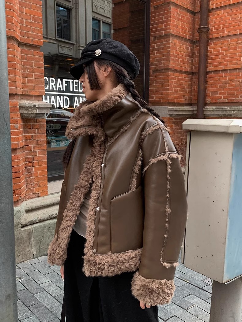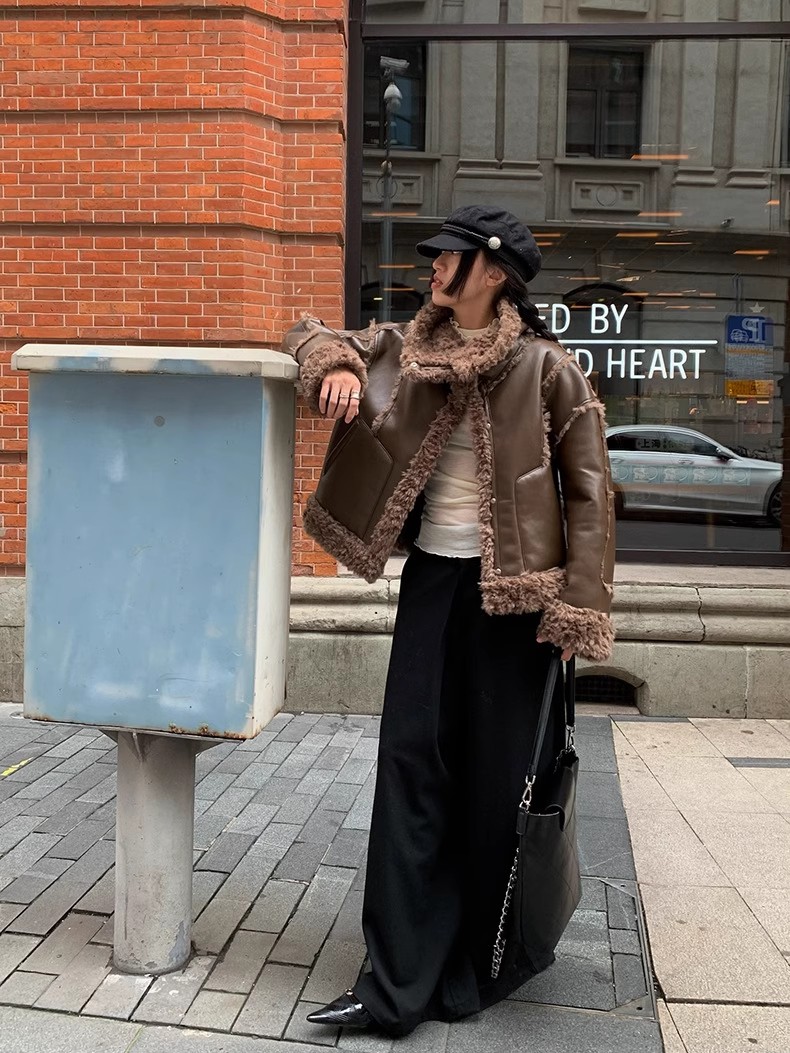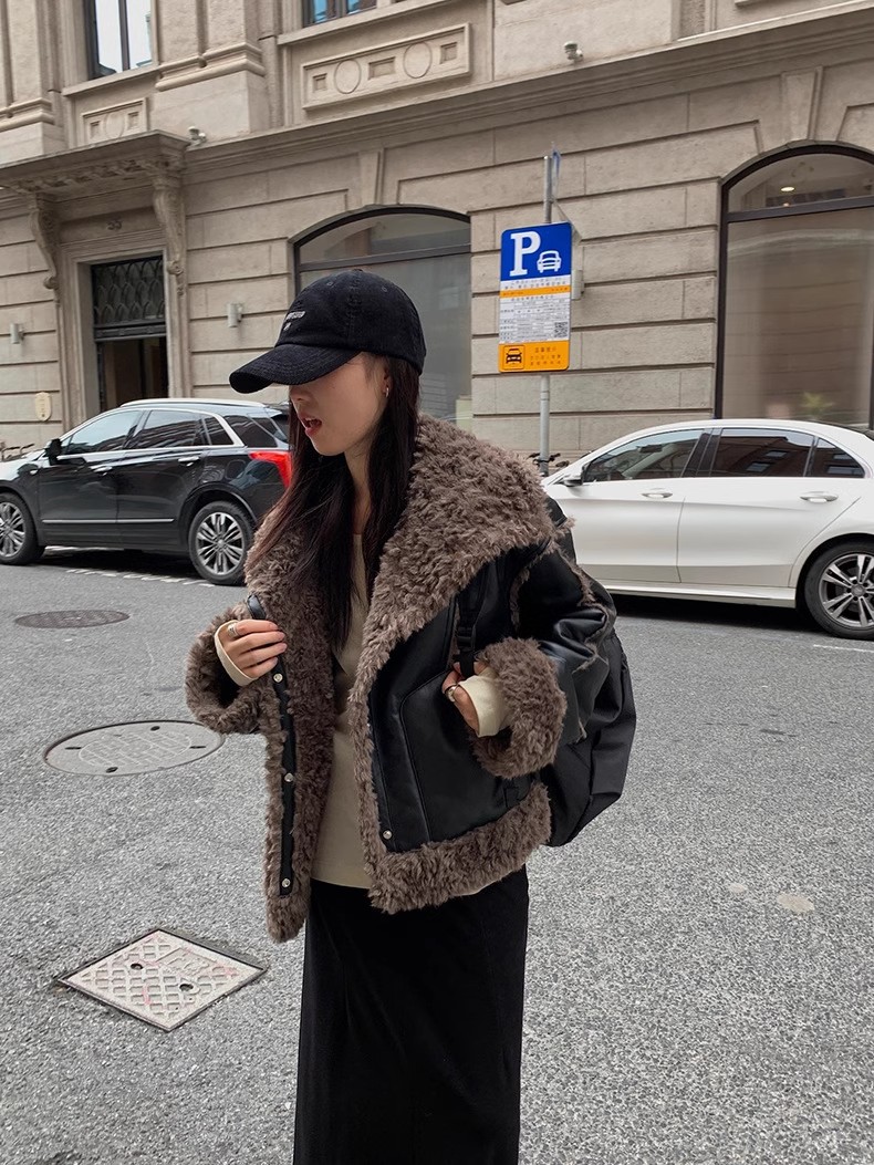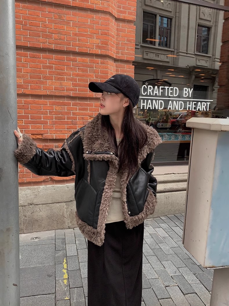 冬季新款复古休闲机车风翻领保暖慵懒皮毛一体宽松短款外套