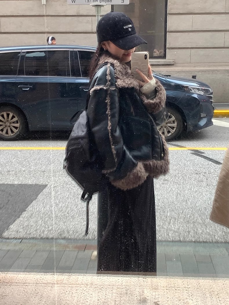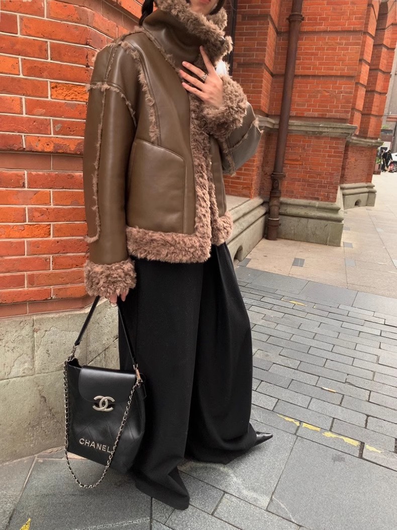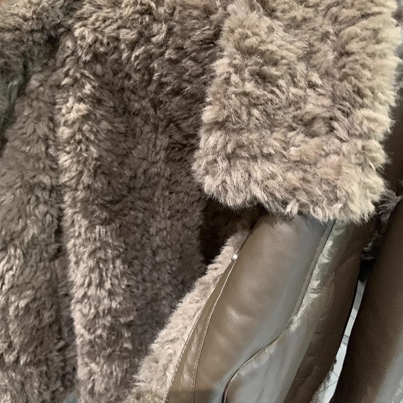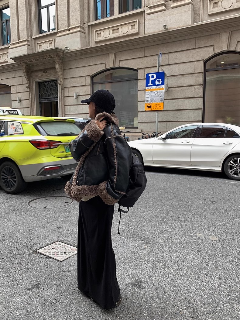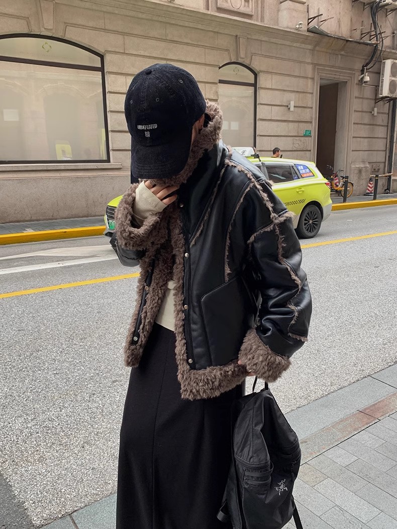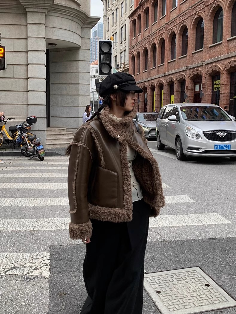 冬季新款复古休闲机车风翻领保暖慵懒皮毛一体宽松短款外套