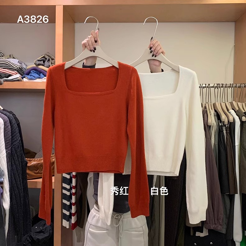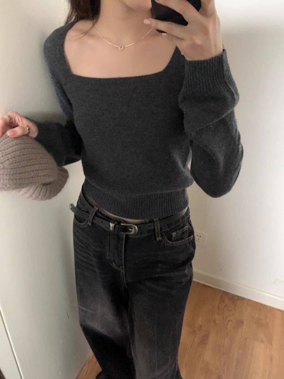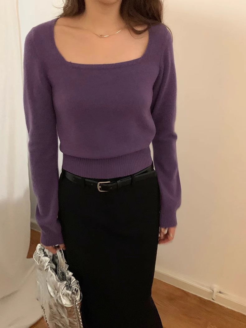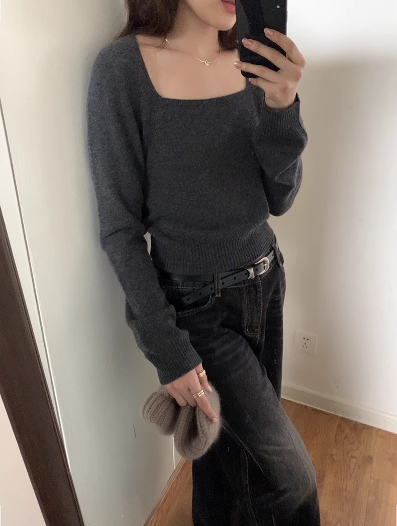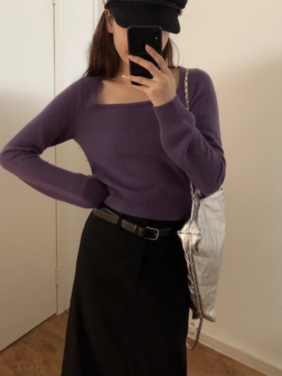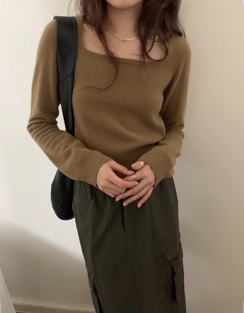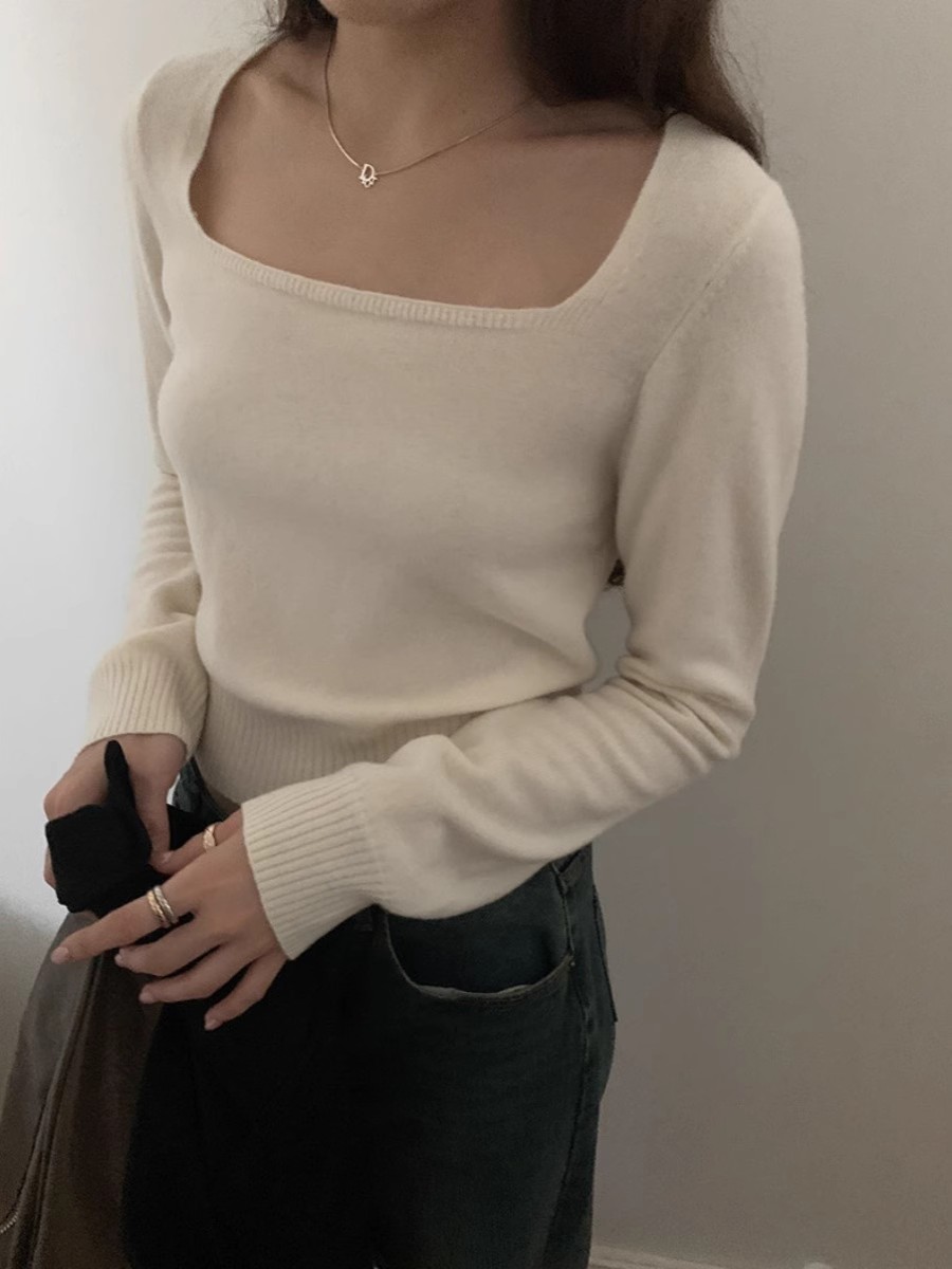 bluepops新款休闲气质纯色常规方领舒适通勤澳羊毛长袖上衣女