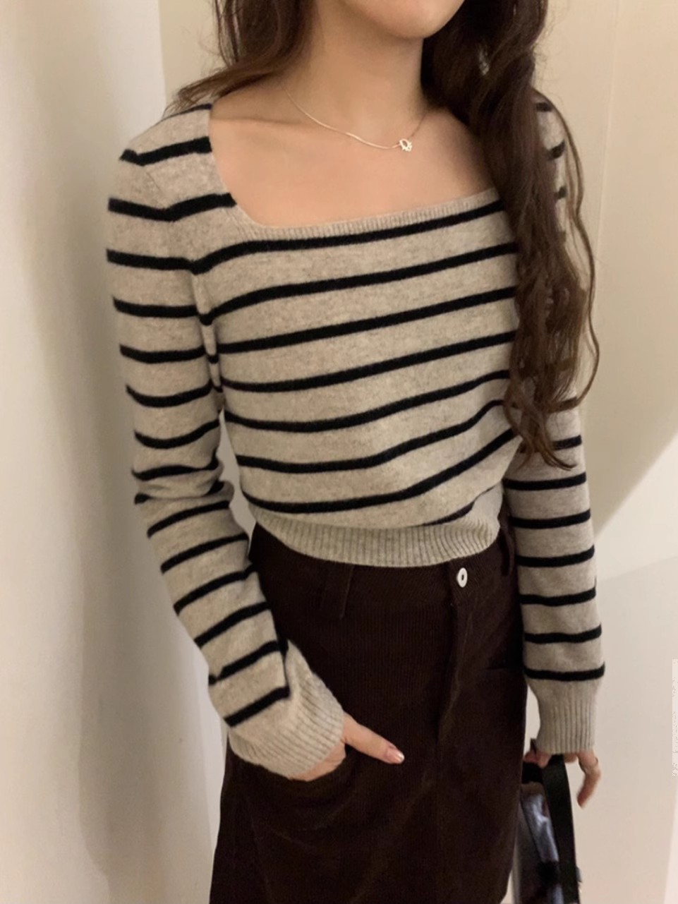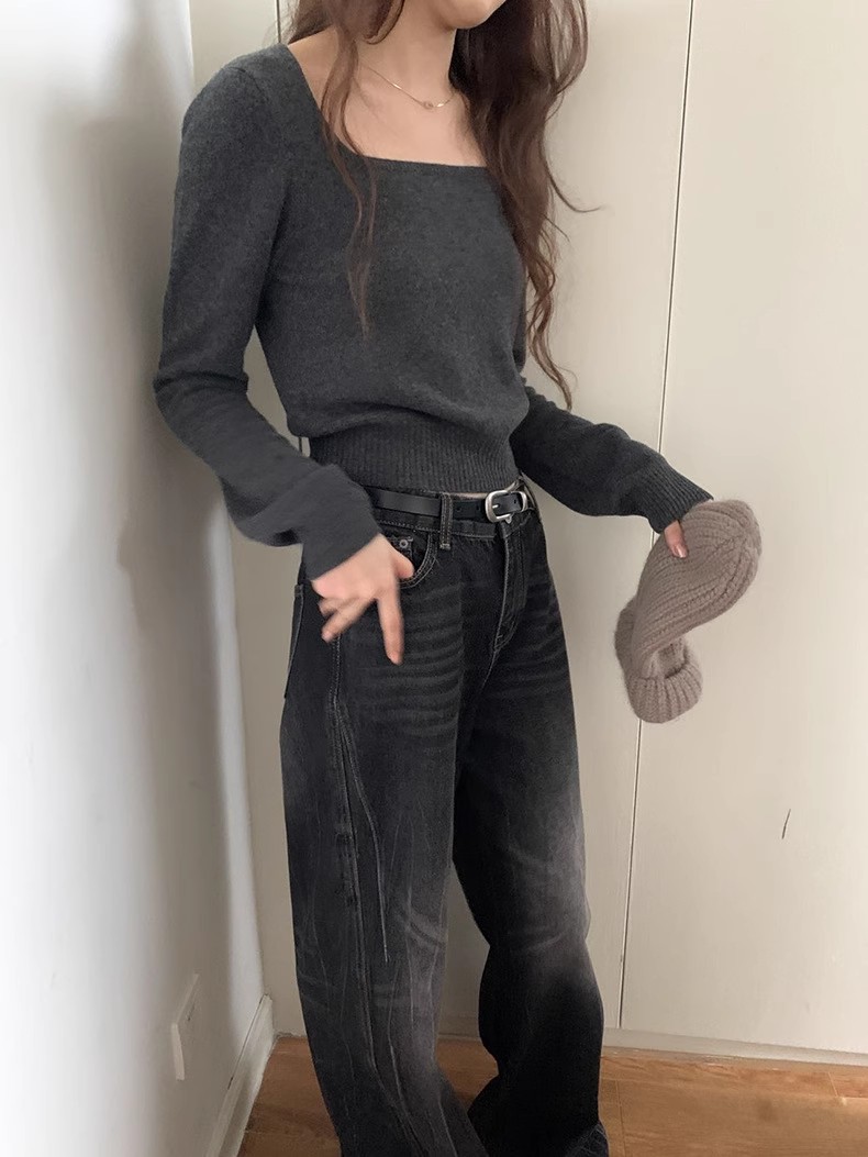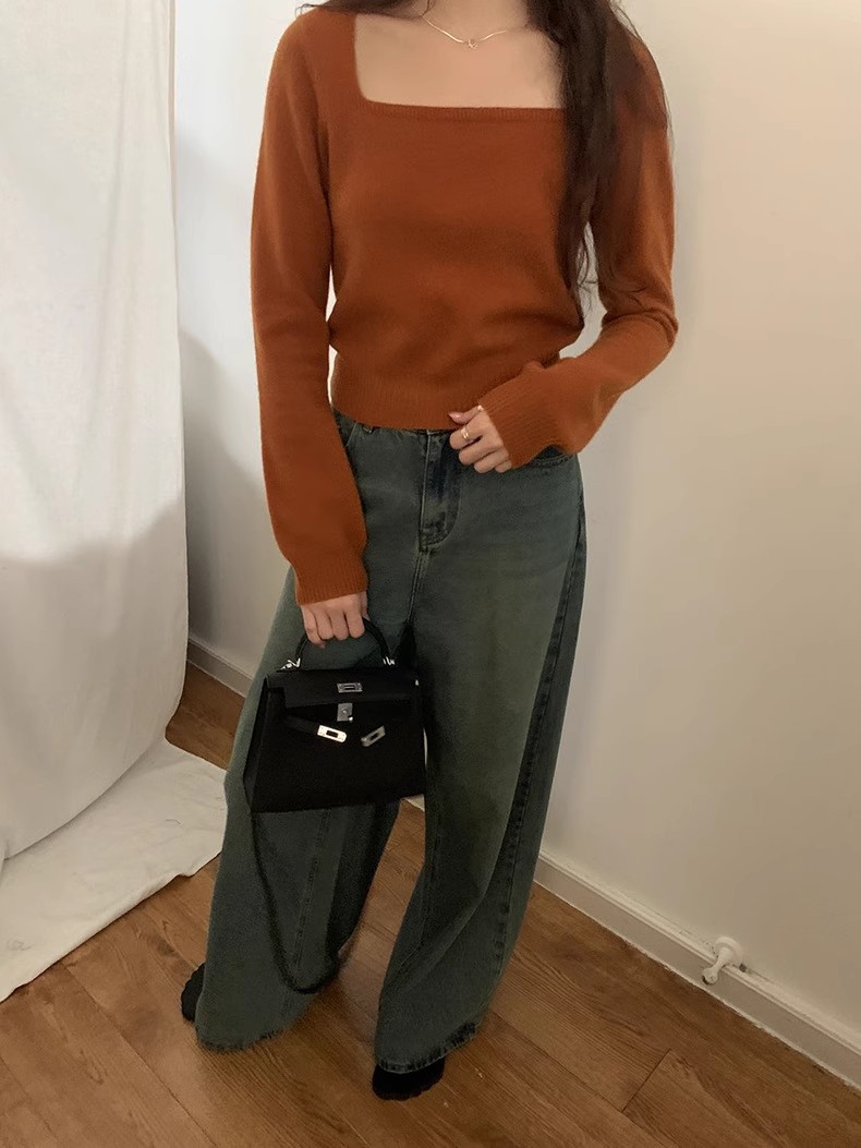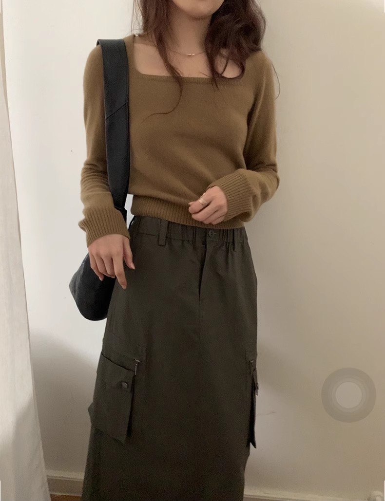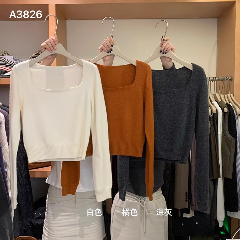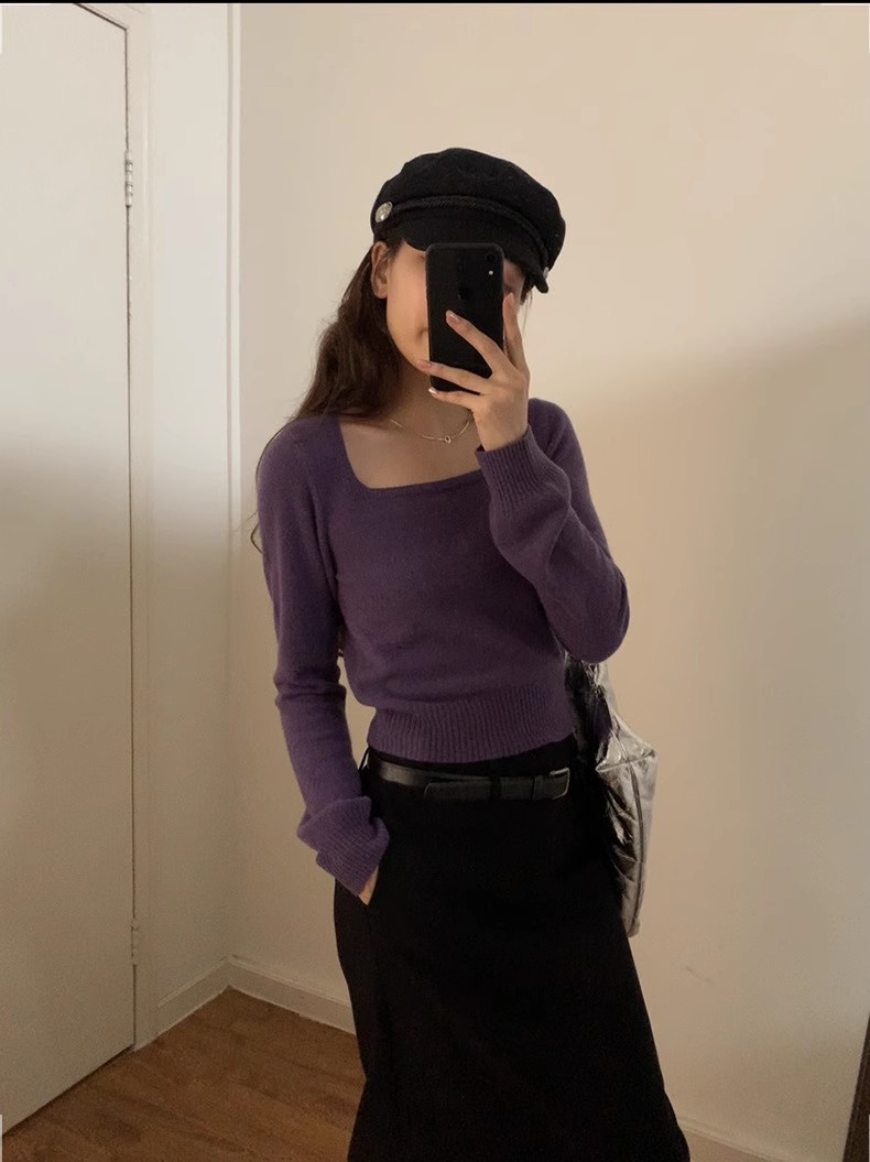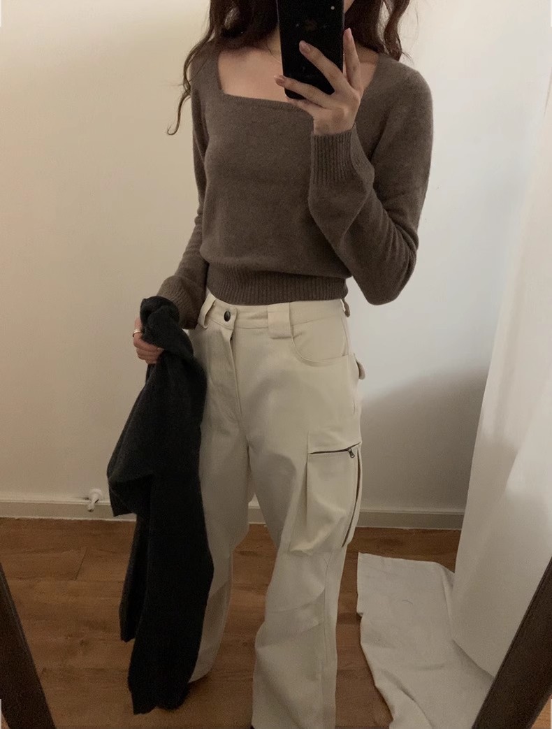 bluepops新款休闲气质纯色常规方领舒适通勤澳羊毛长袖上衣女