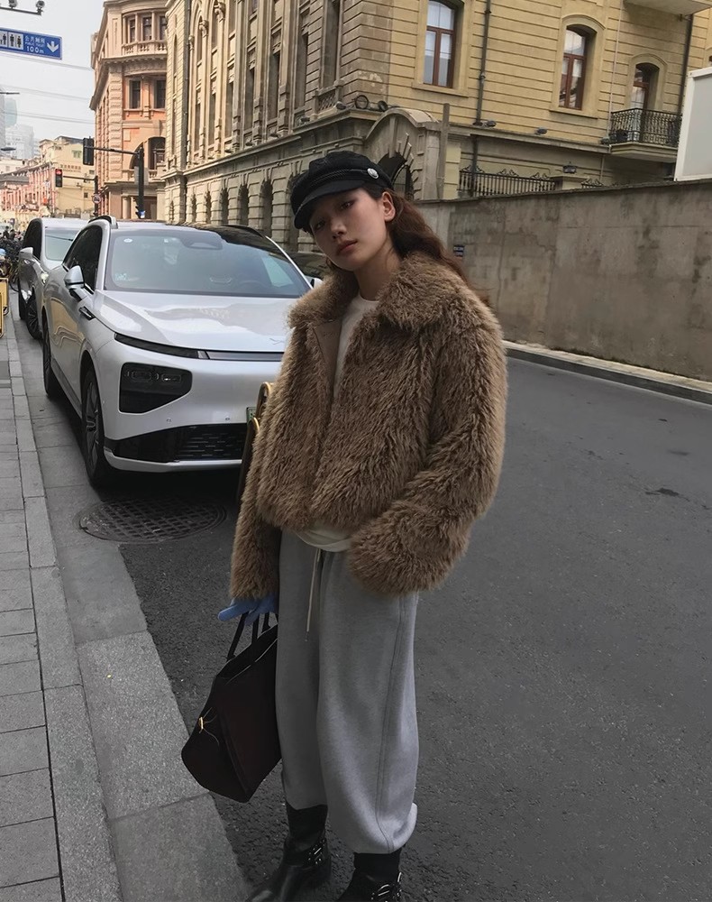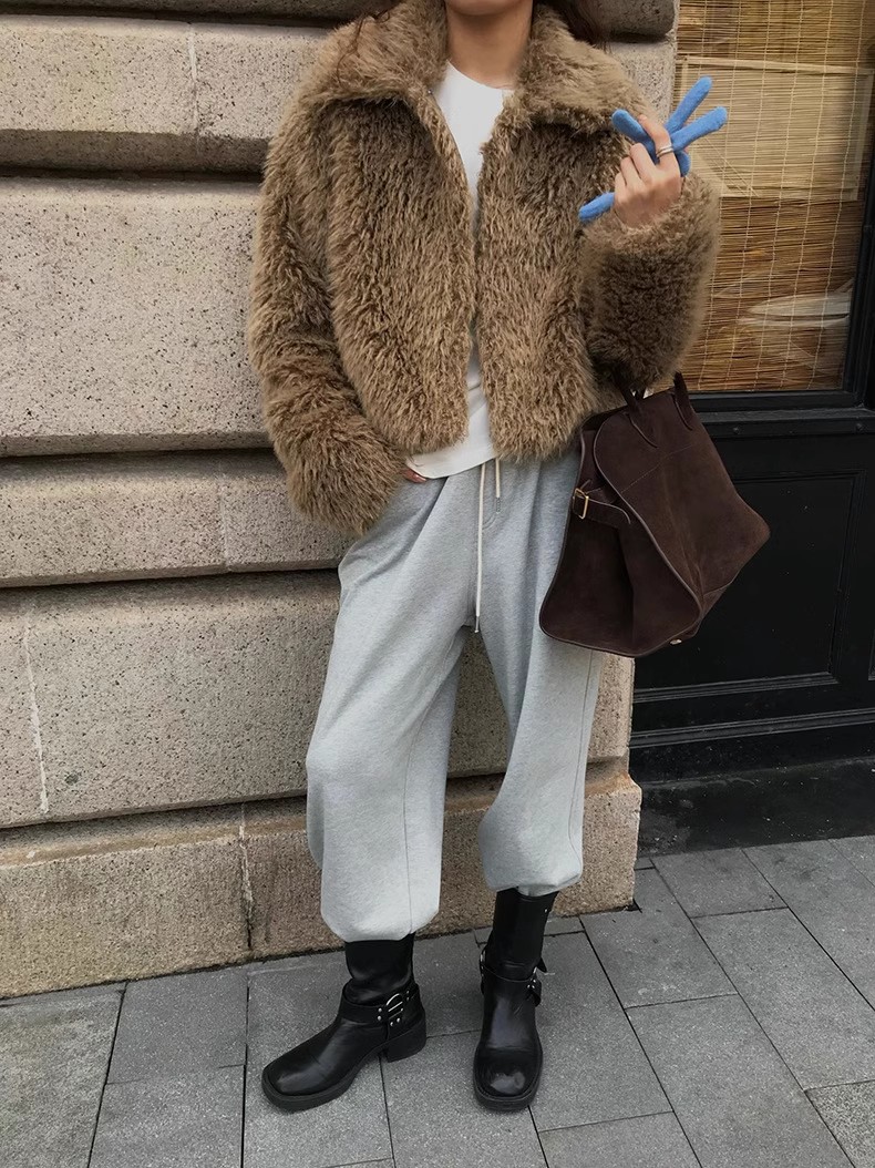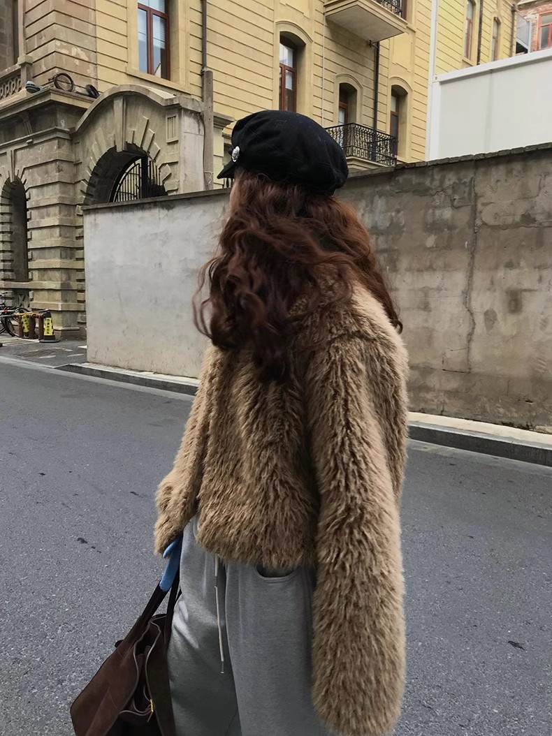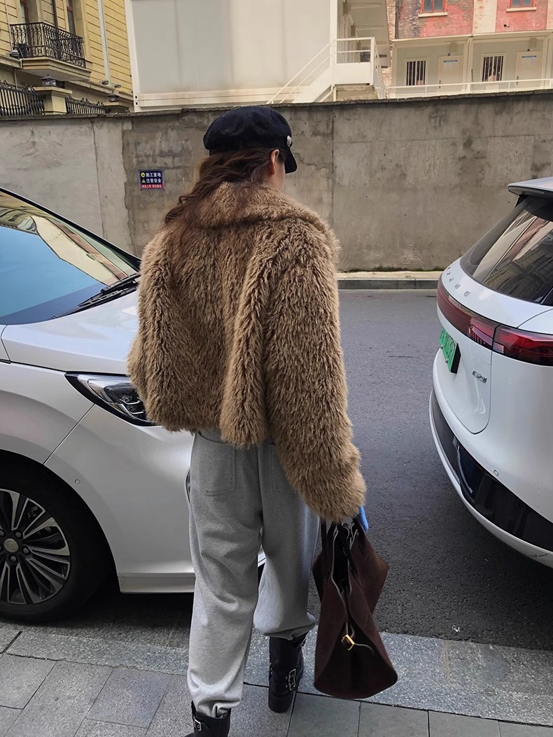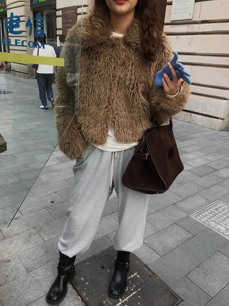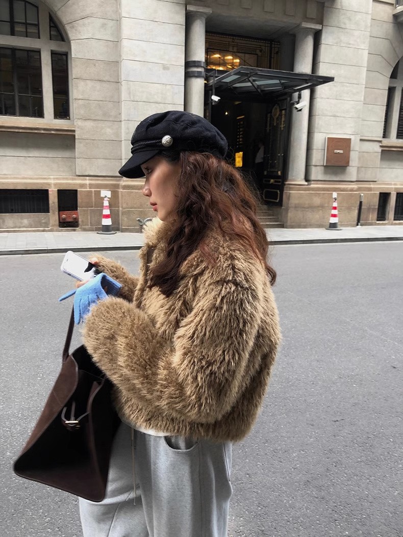 冬季新款韩版复古休闲高级感慵懒翻领加厚保暖皮毛一体短外套