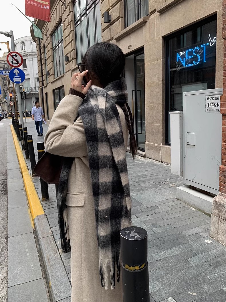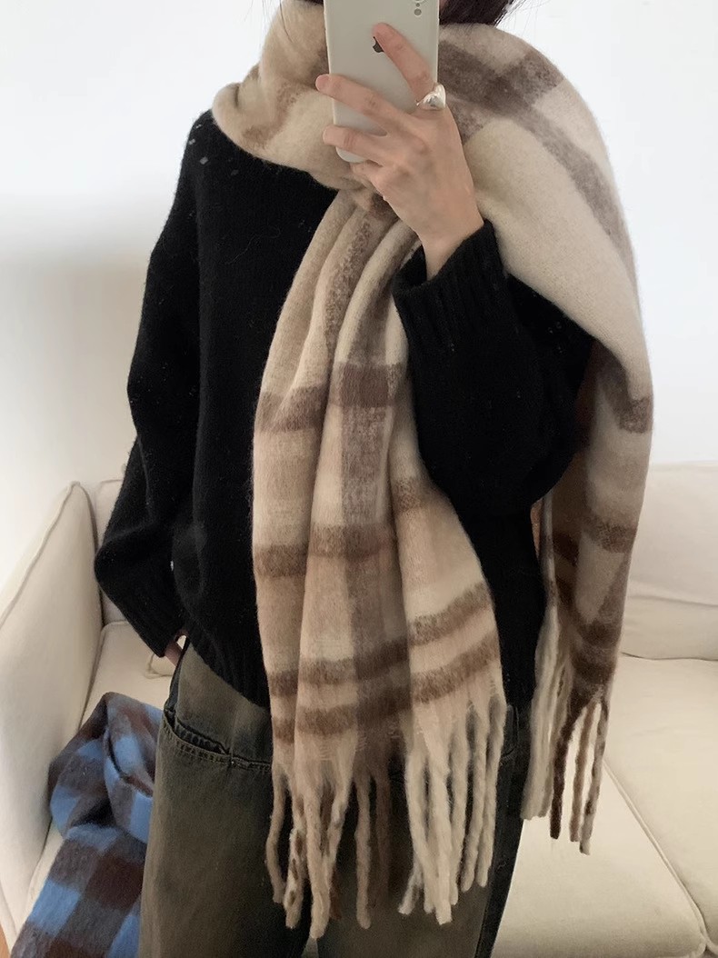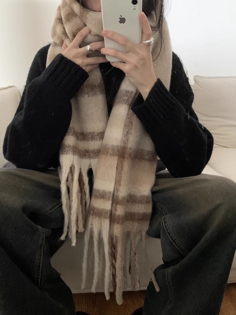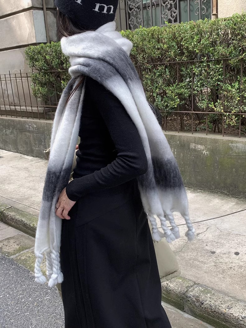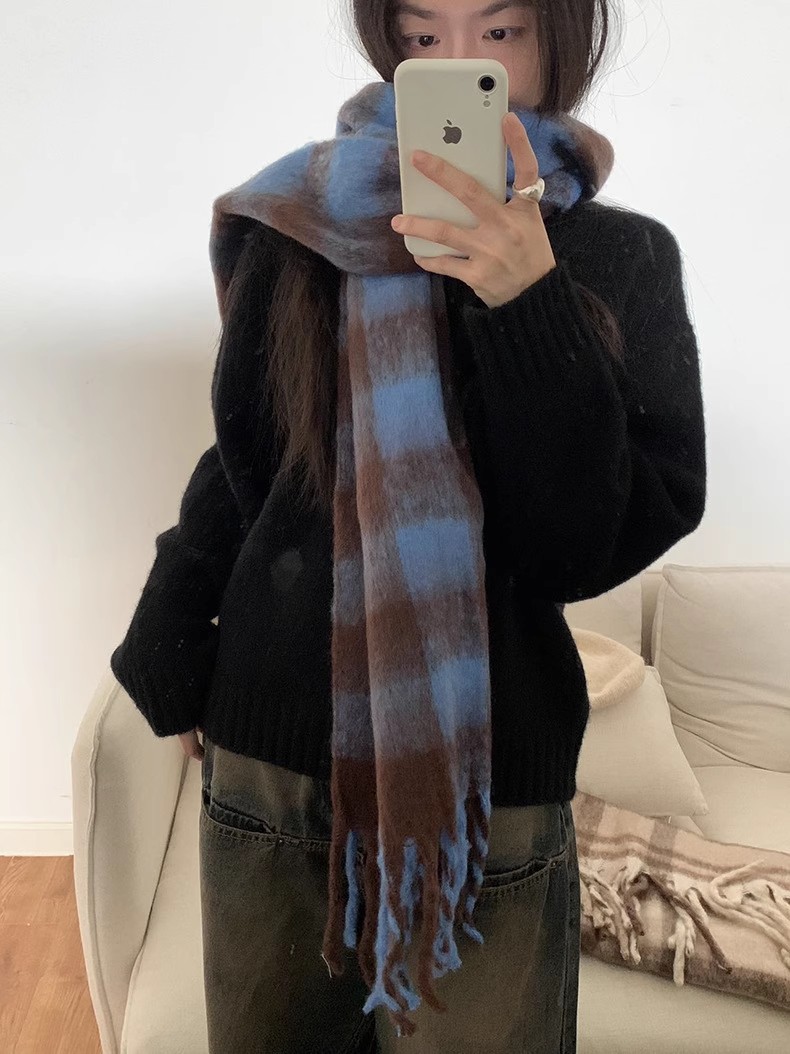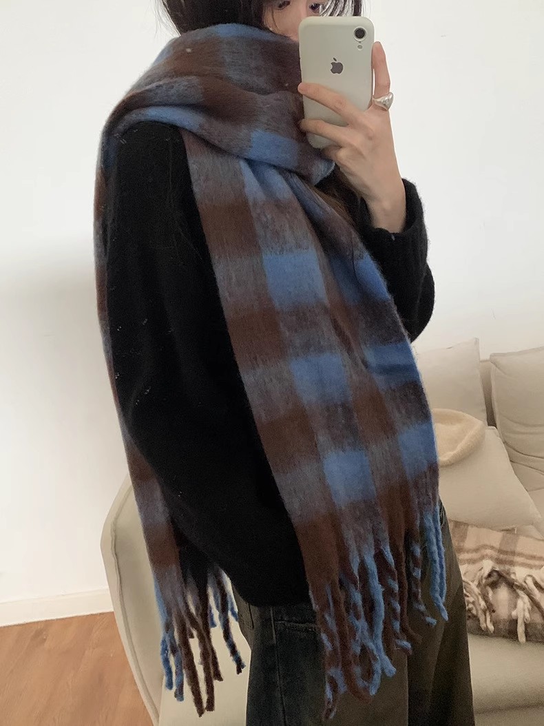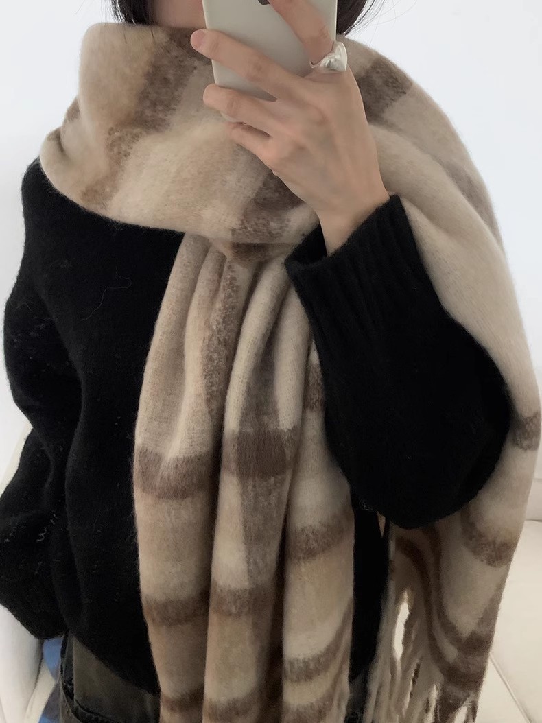 冬季新款韩版休闲慵懒渐变色格子仿羊绒加厚保暖流苏披肩围巾