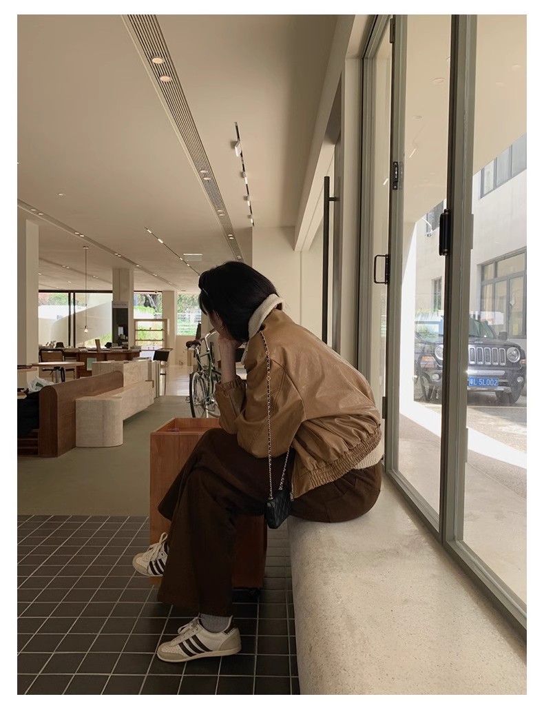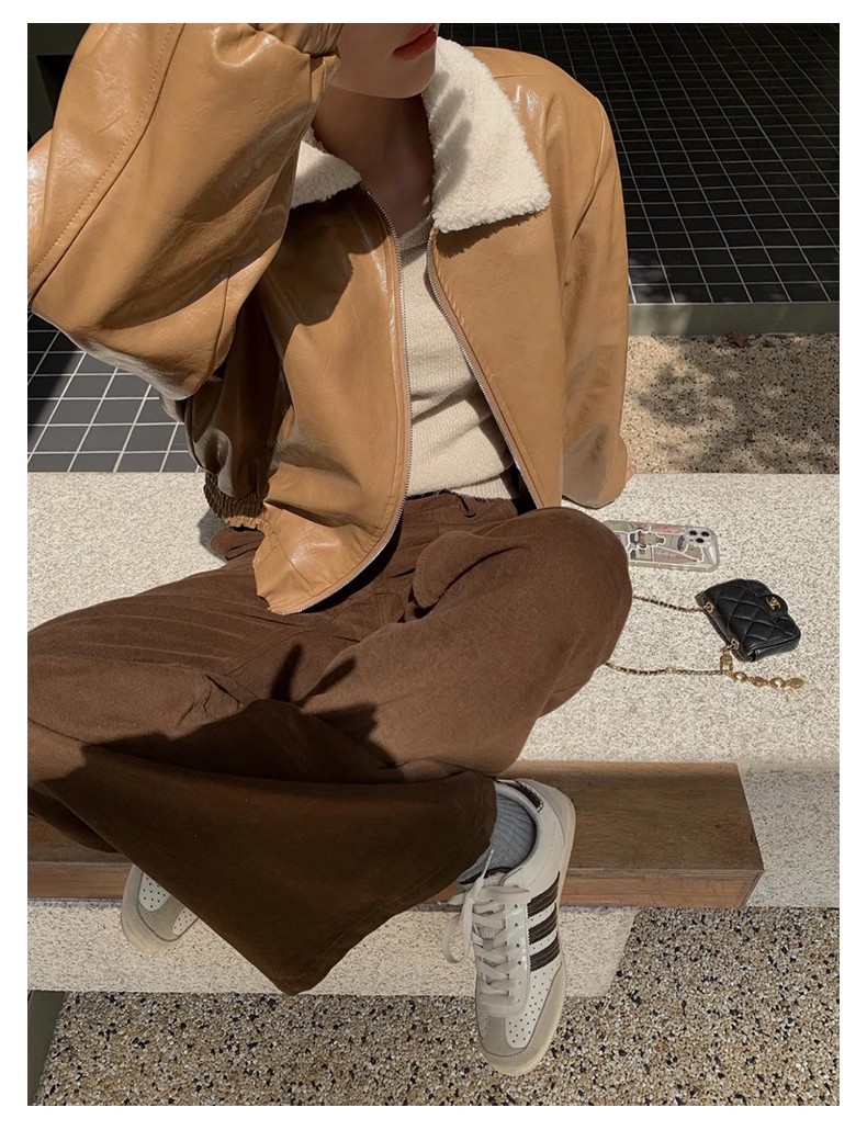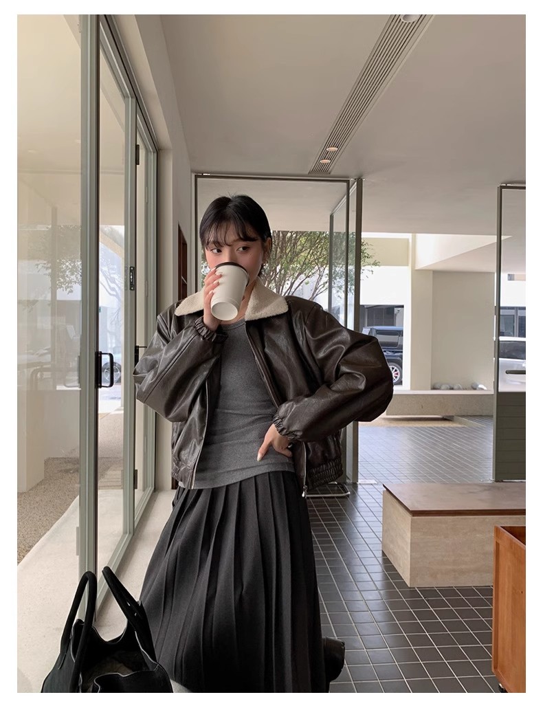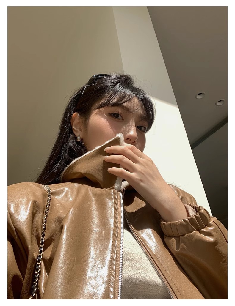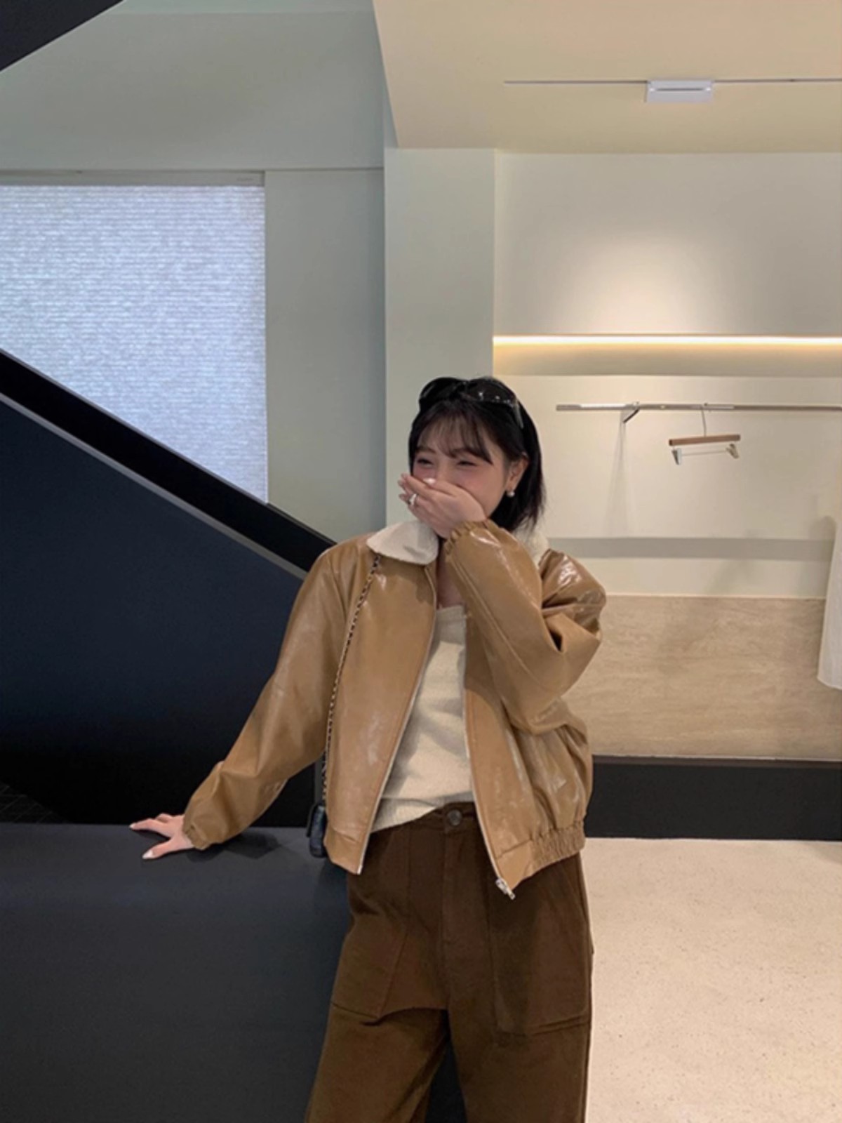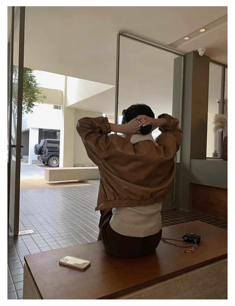 冬季新款美拉德休闲毛领拉链翻领皮夹克复古皮衣加厚短款外套