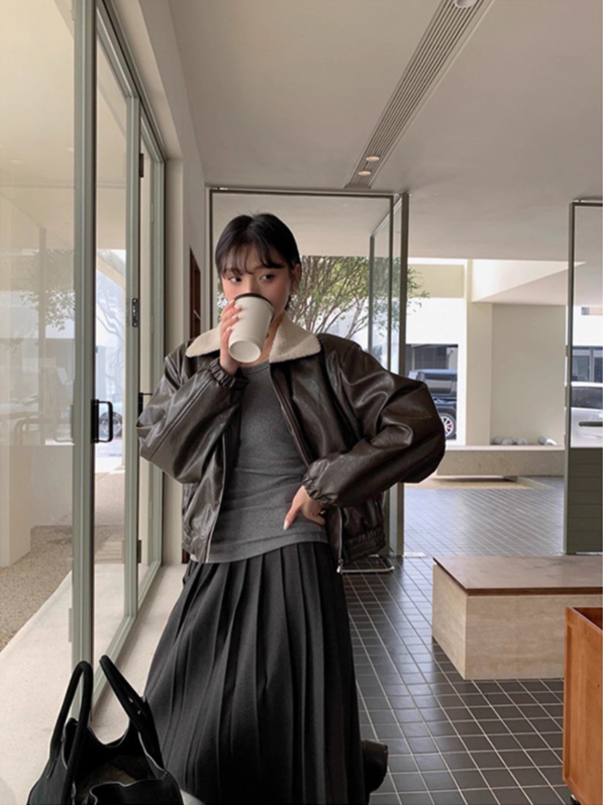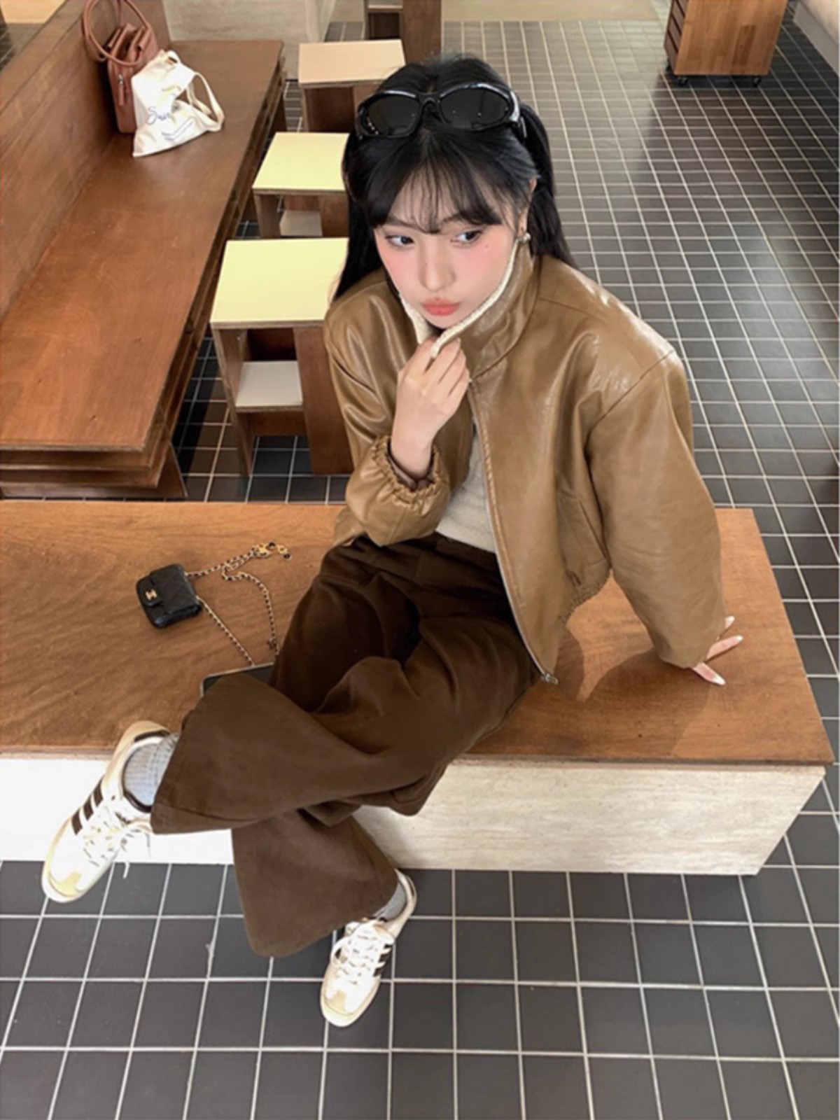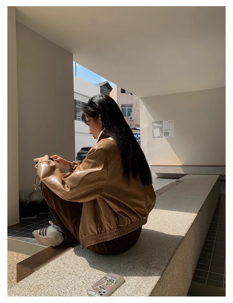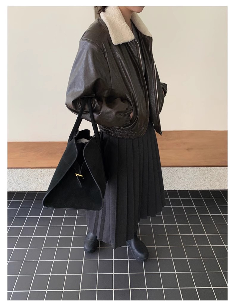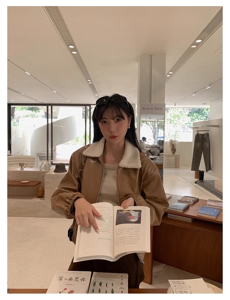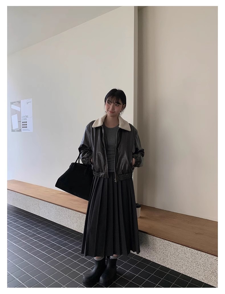 冬季新款美拉德休闲毛领拉链翻领皮夹克复古皮衣加厚短款外套