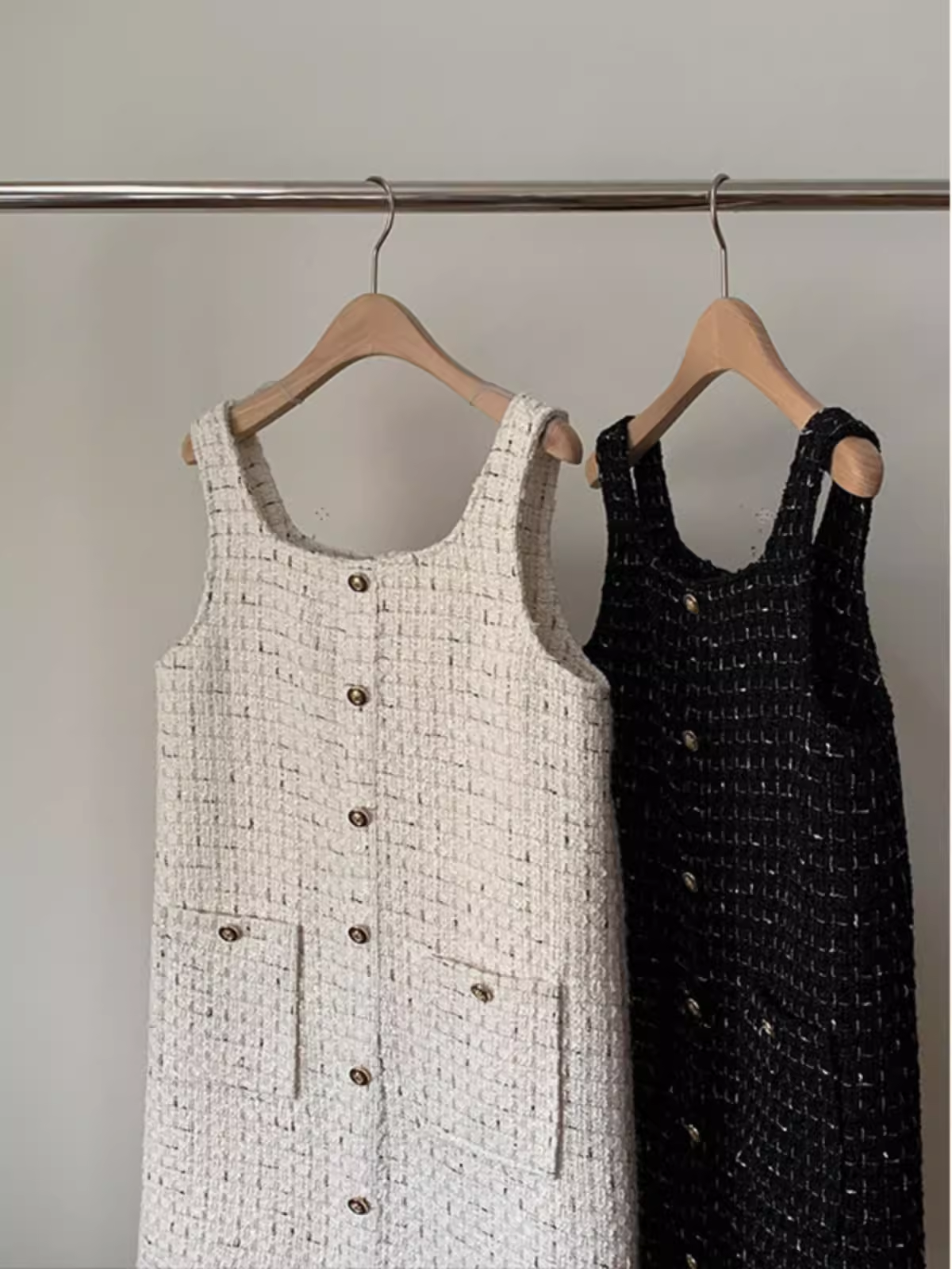 春秋新款小香风连衣裙女韩版通勤显瘦背心短裙纯色单排扣外搭