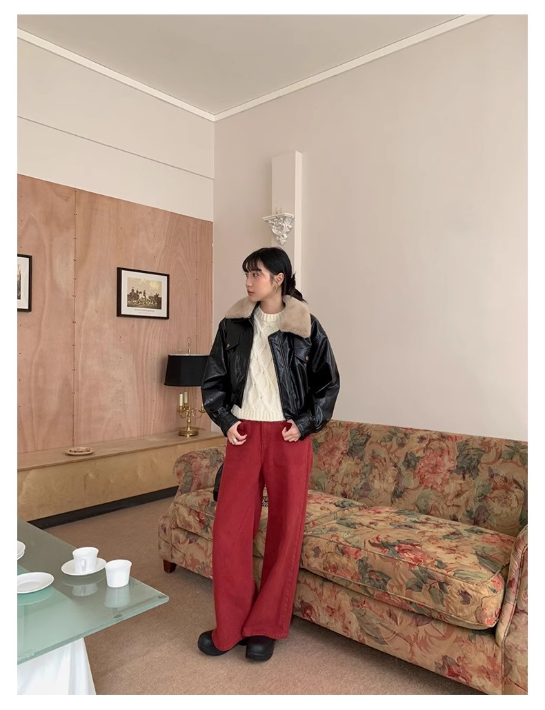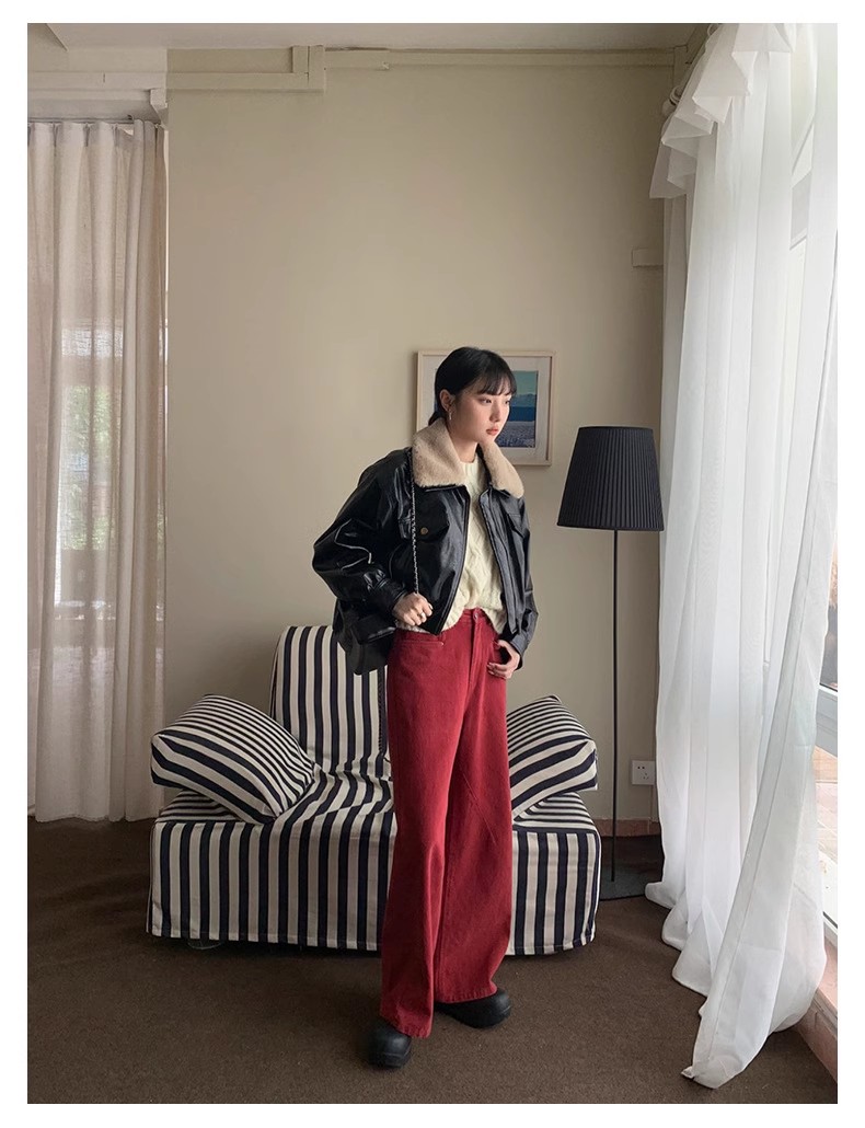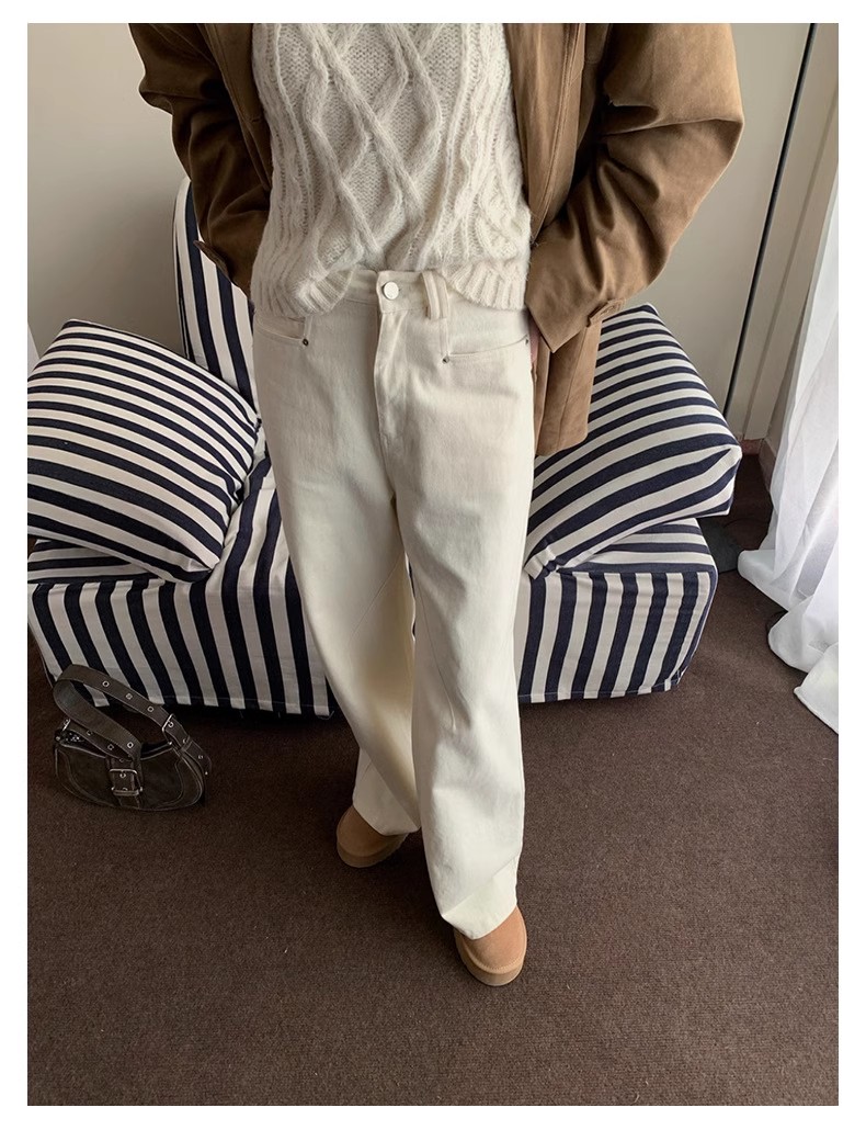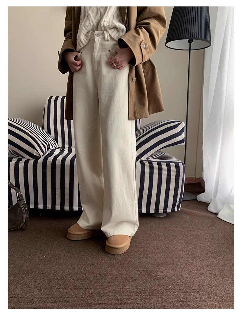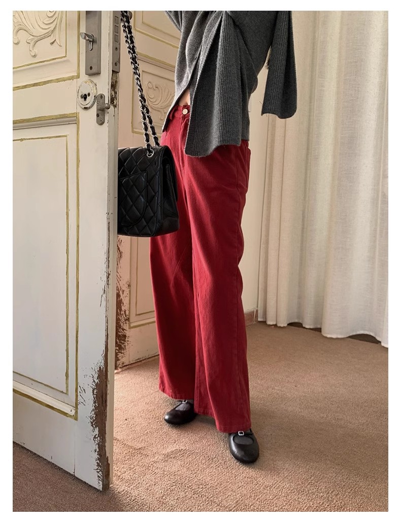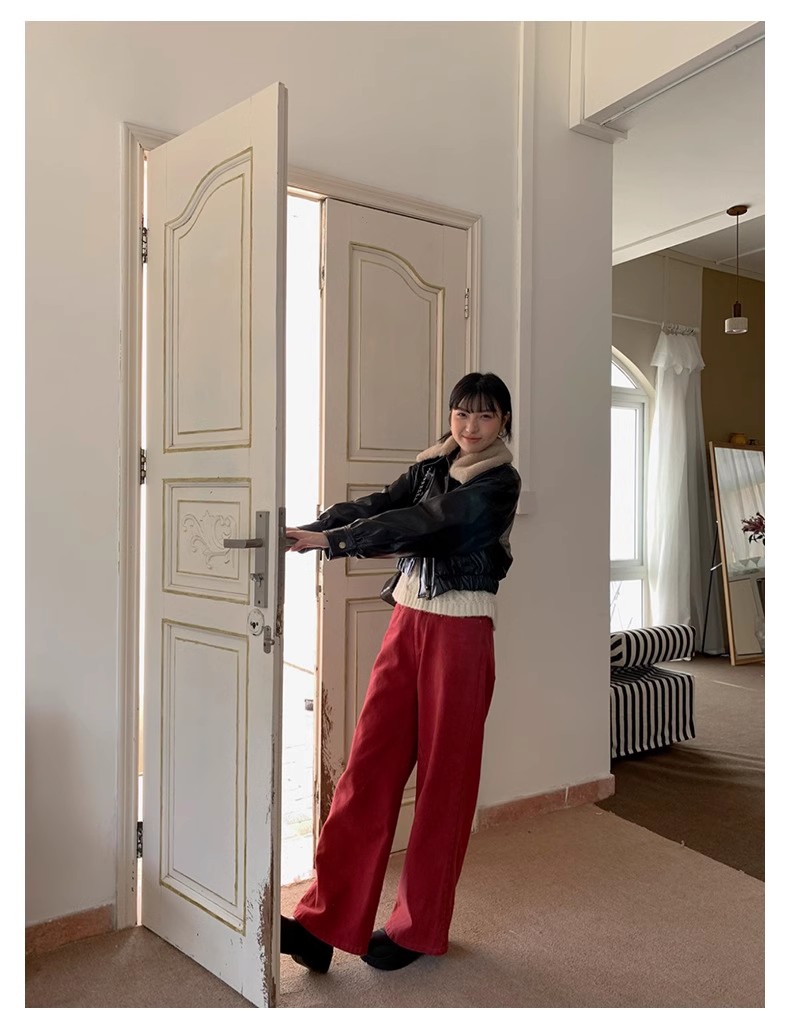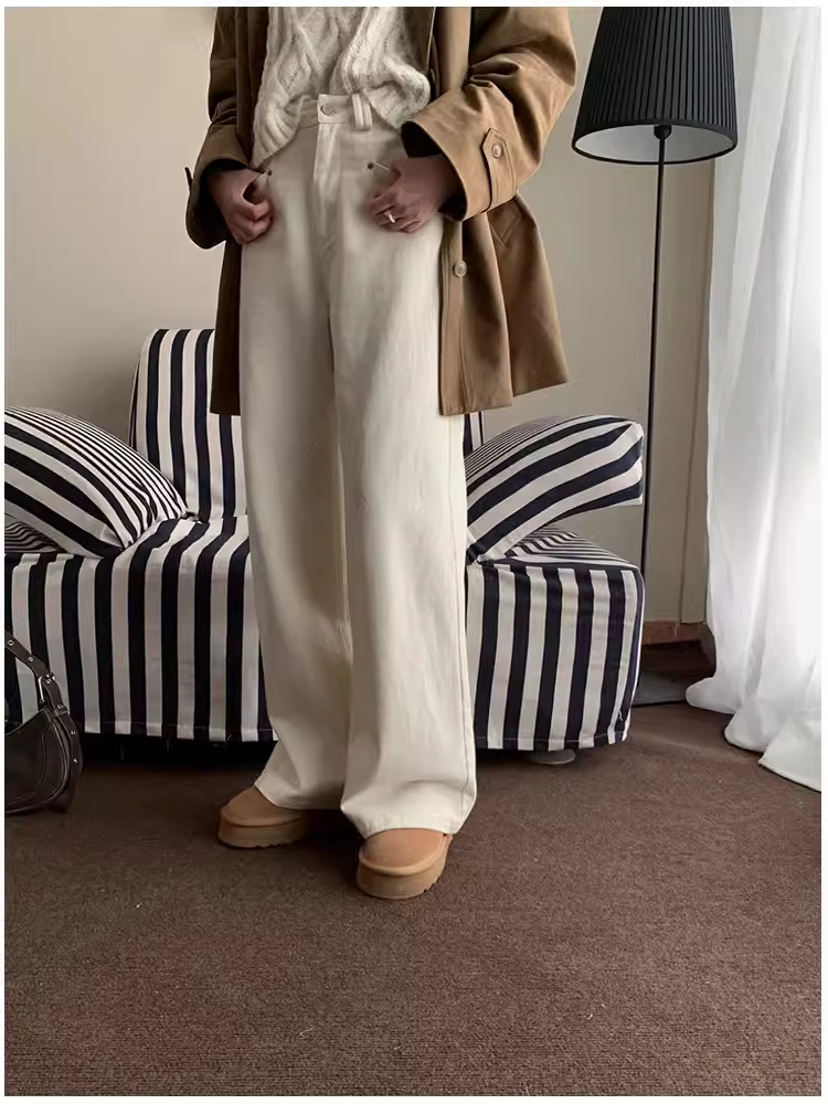 冬季新款复古水洗磨毛纯色休闲裤子显瘦高腰直筒裤百搭长裤