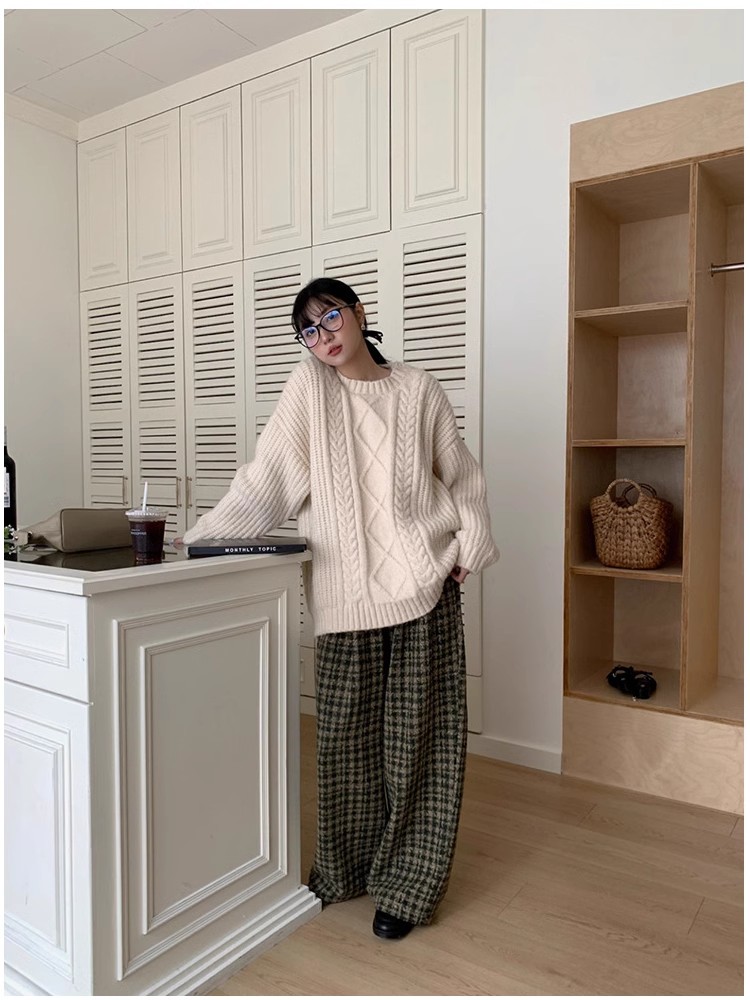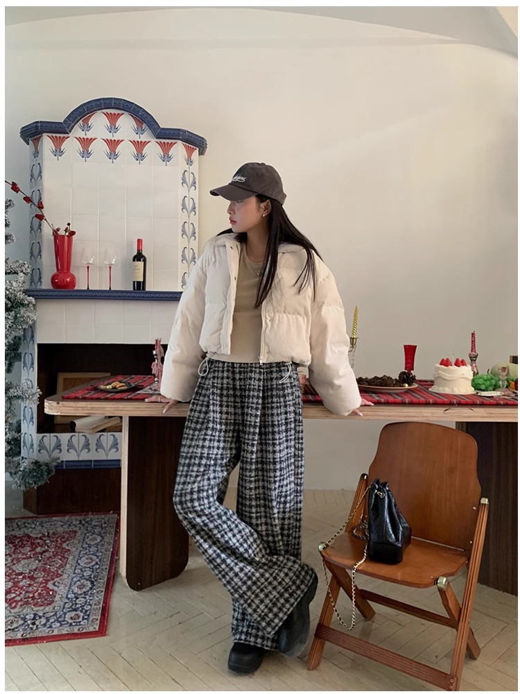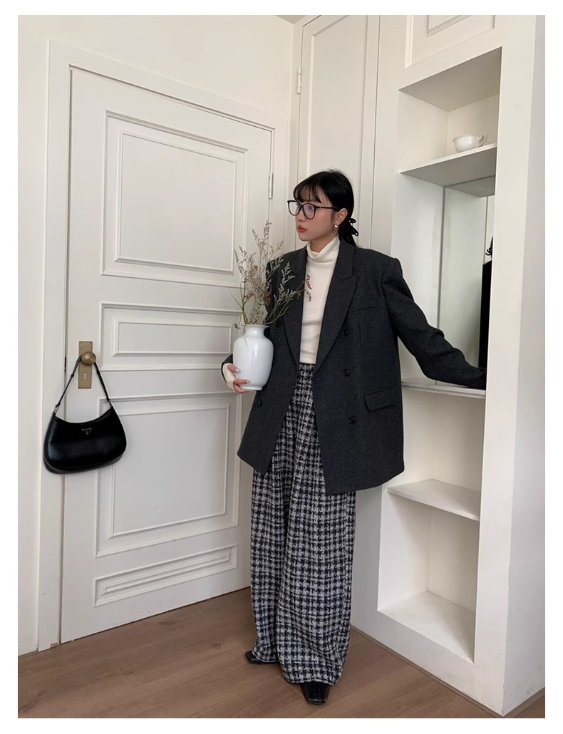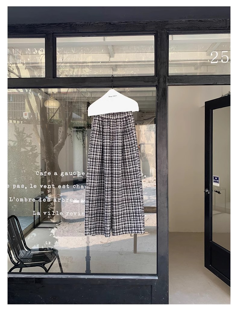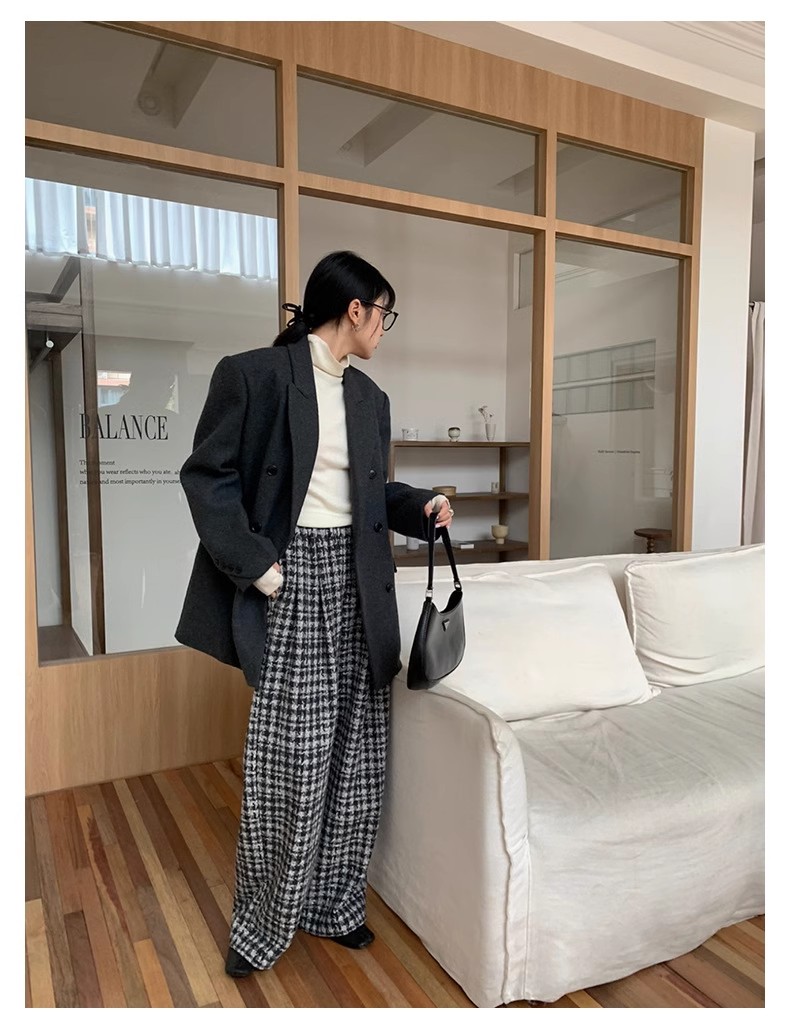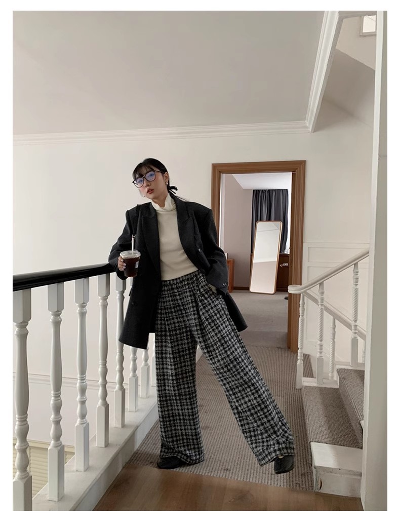 冬季新款复古长款撞色千鸟格高腰阔腿裤百搭休闲垂坠感羊毛裤