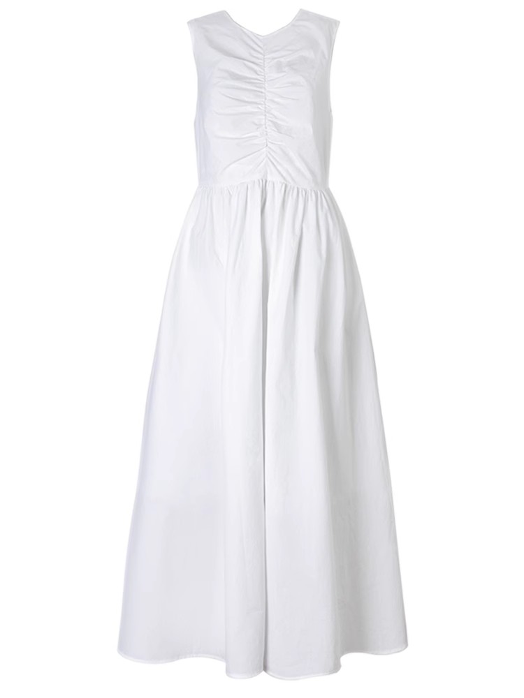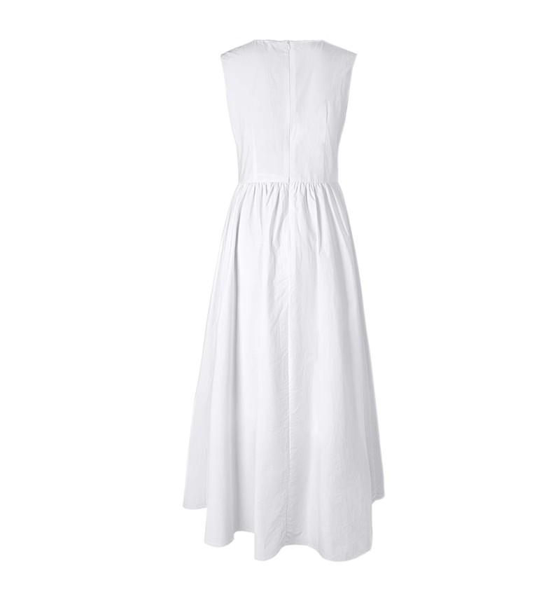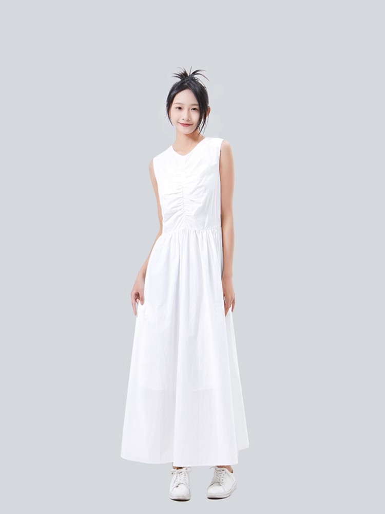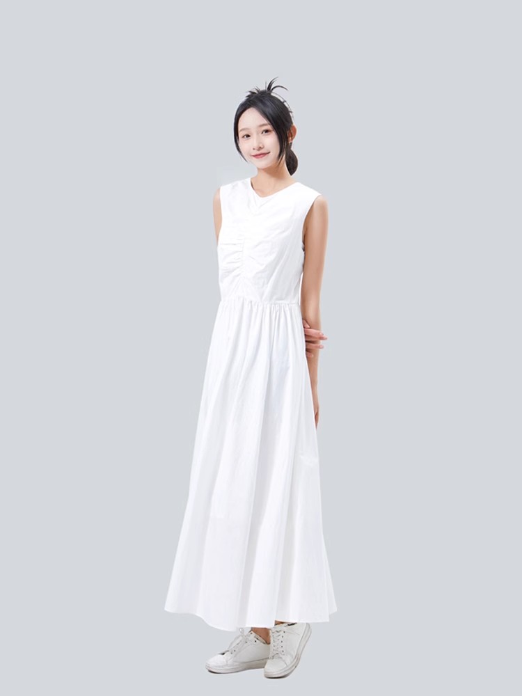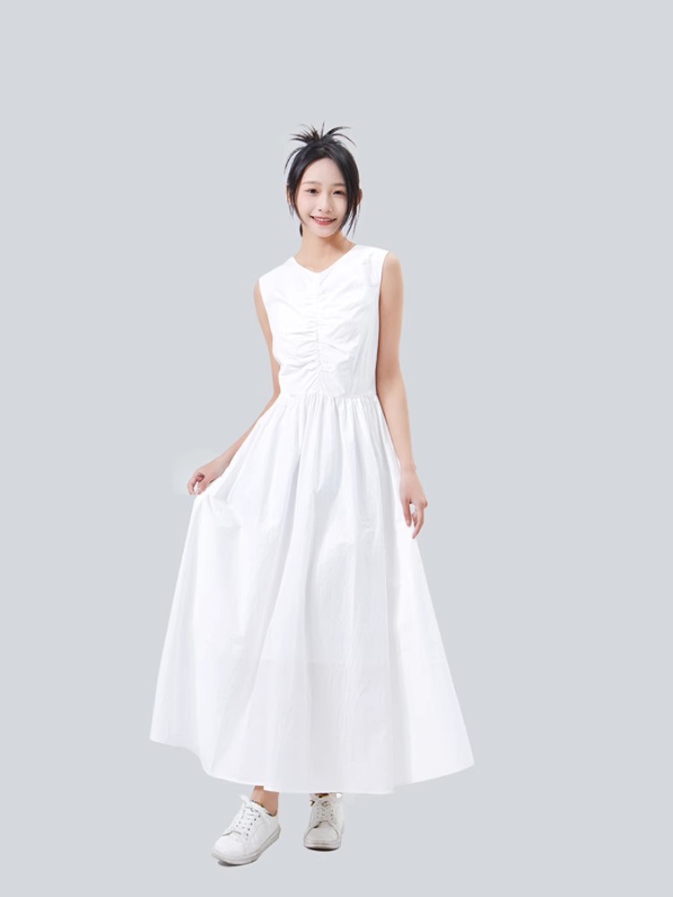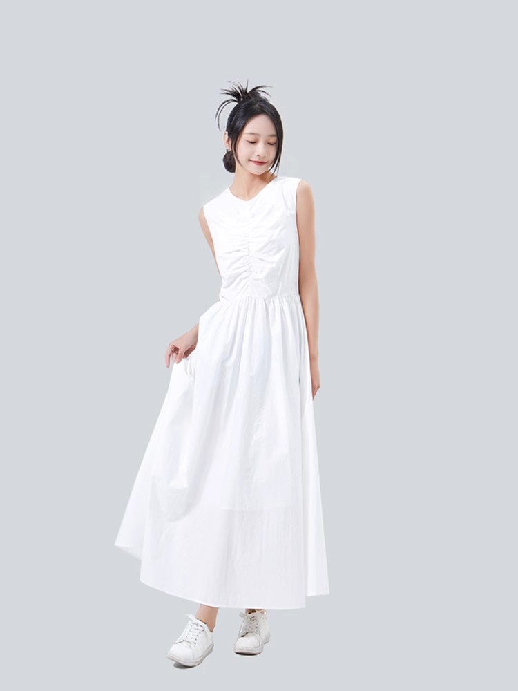 夏季新款日韩休闲气质薄款无袖收腰圆领款修身白色高腰连衣裙