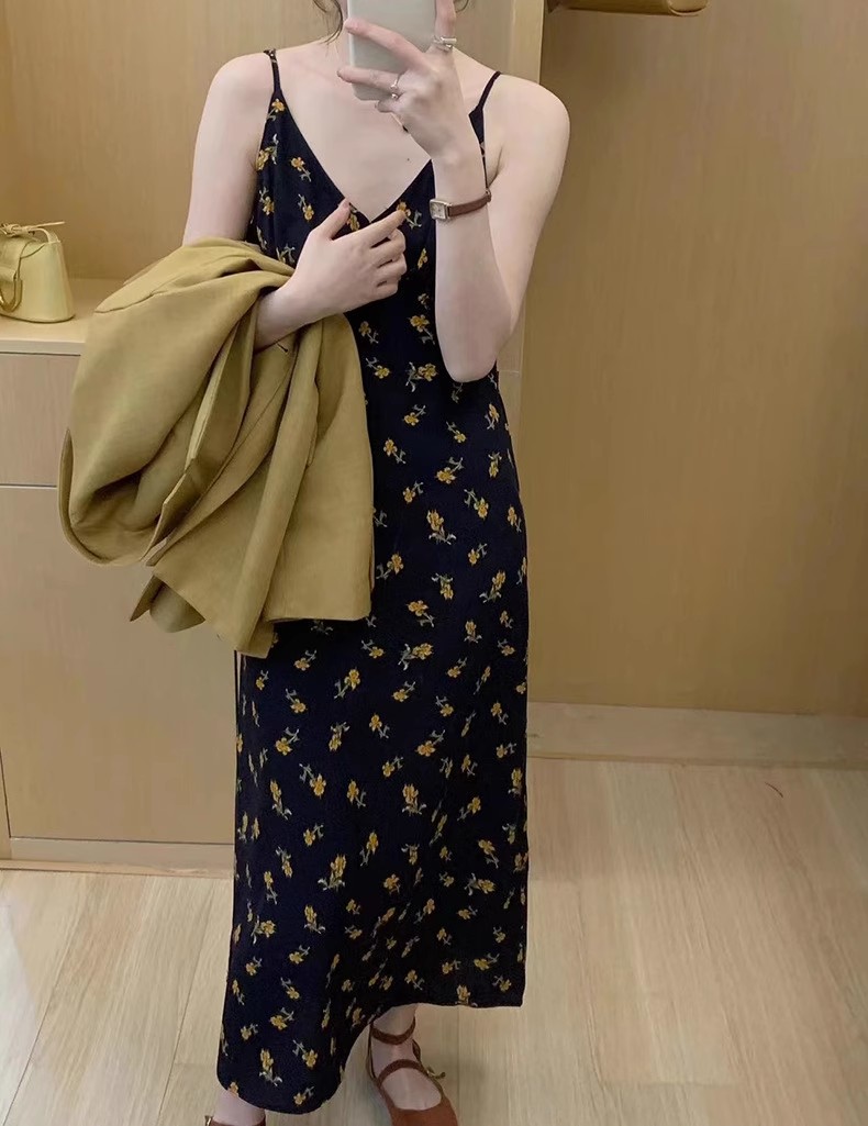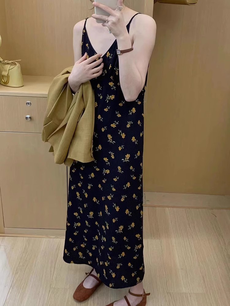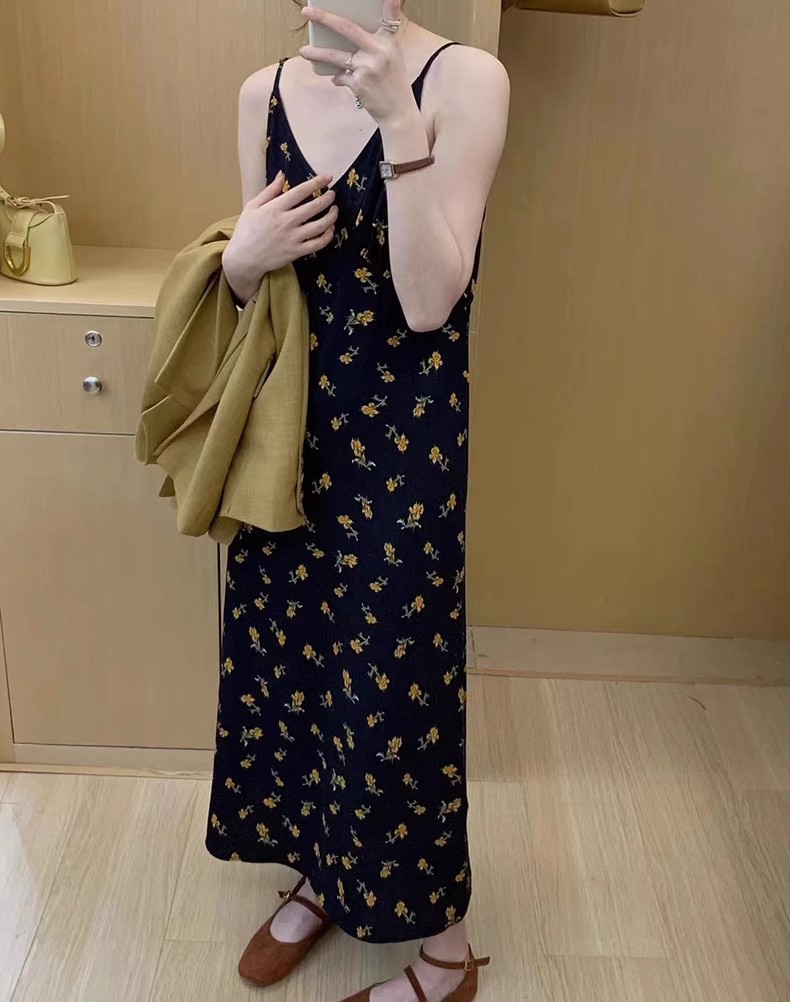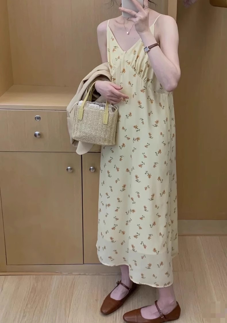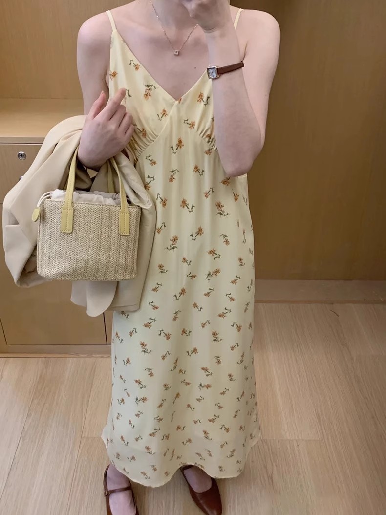 黄色碎花吊带连衣裙夏季新款法式V领可调节肩带内搭中长裙