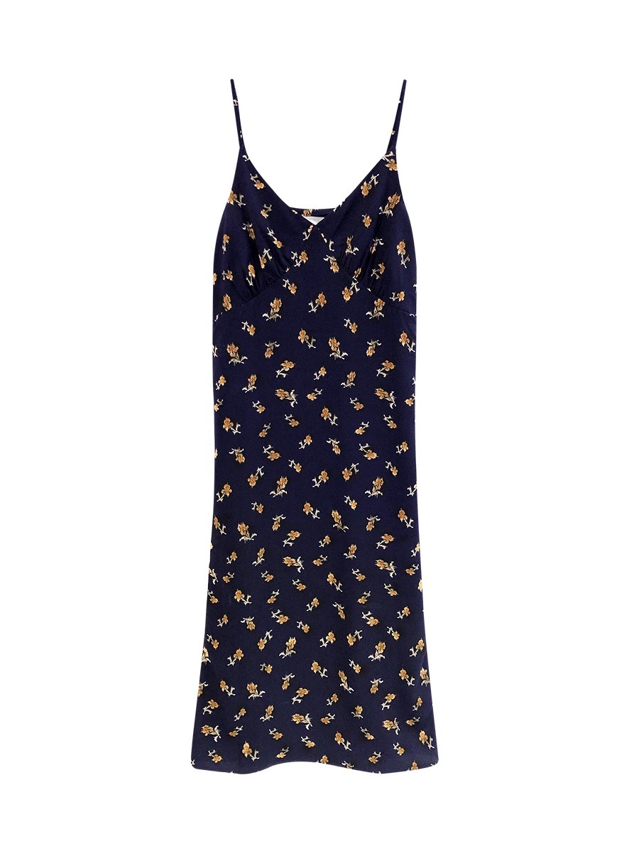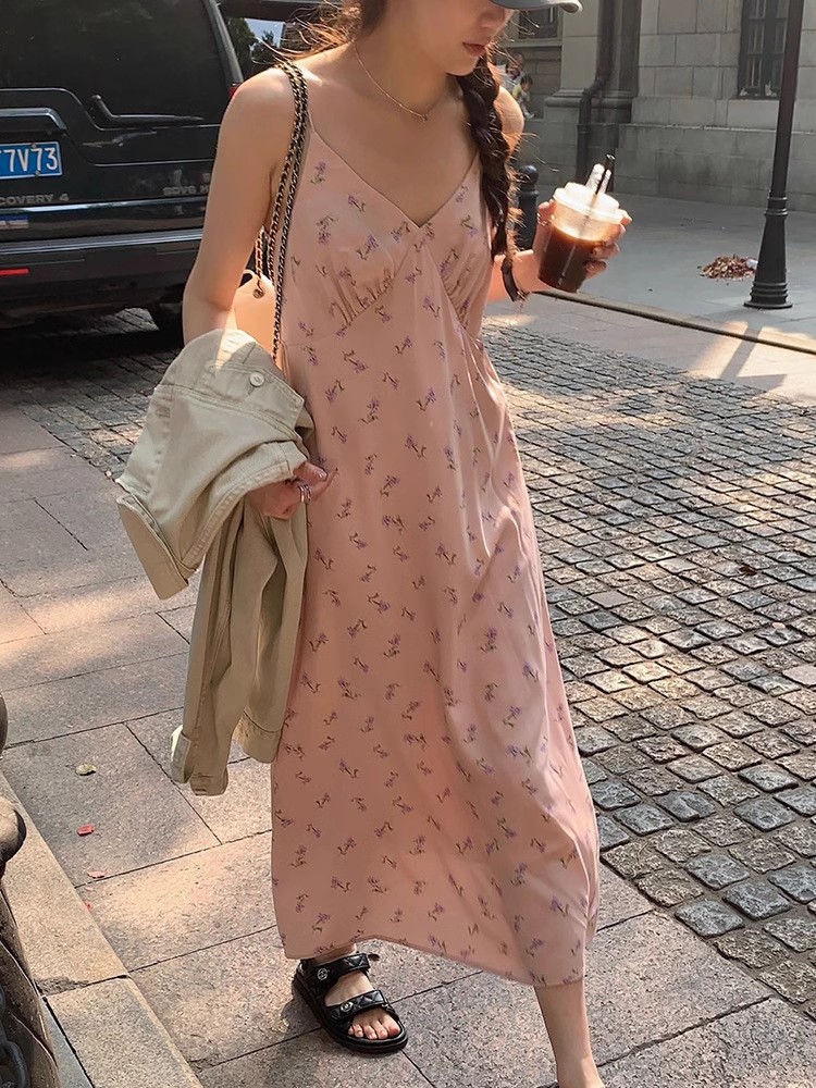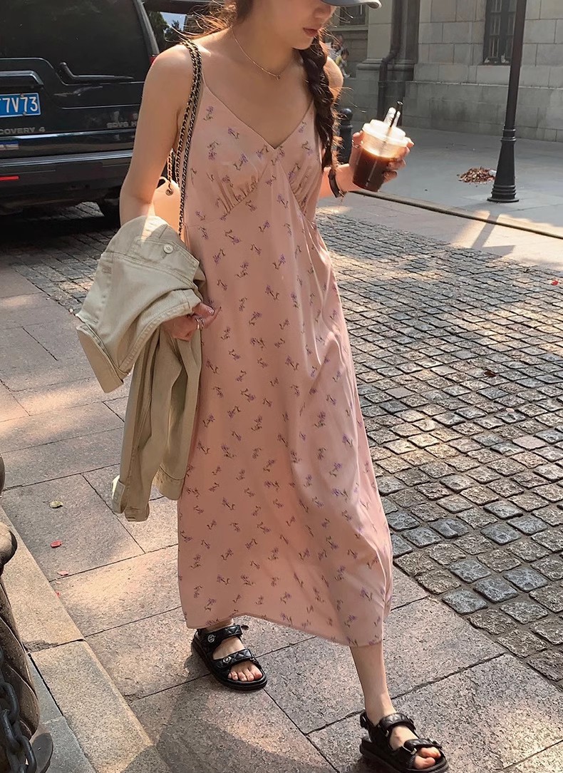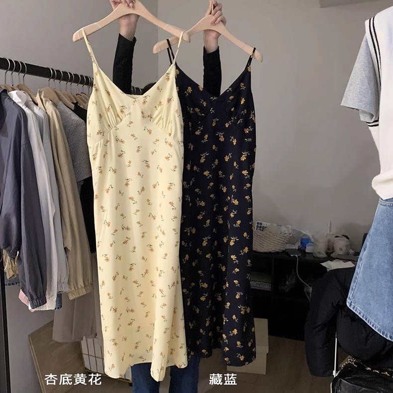 黄色碎花吊带连衣裙夏季新款法式V领可调节肩带内搭中长裙