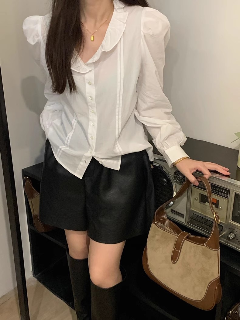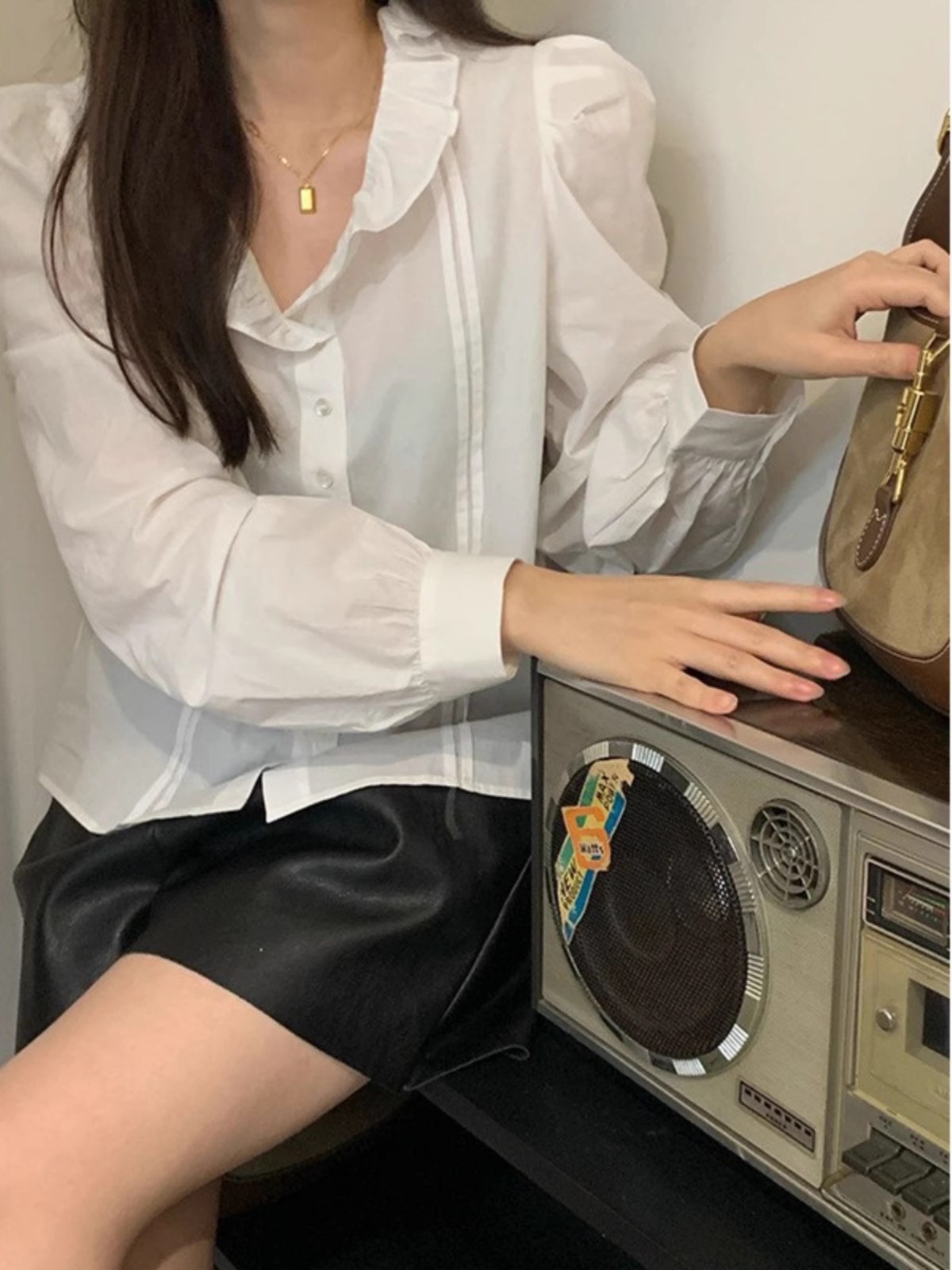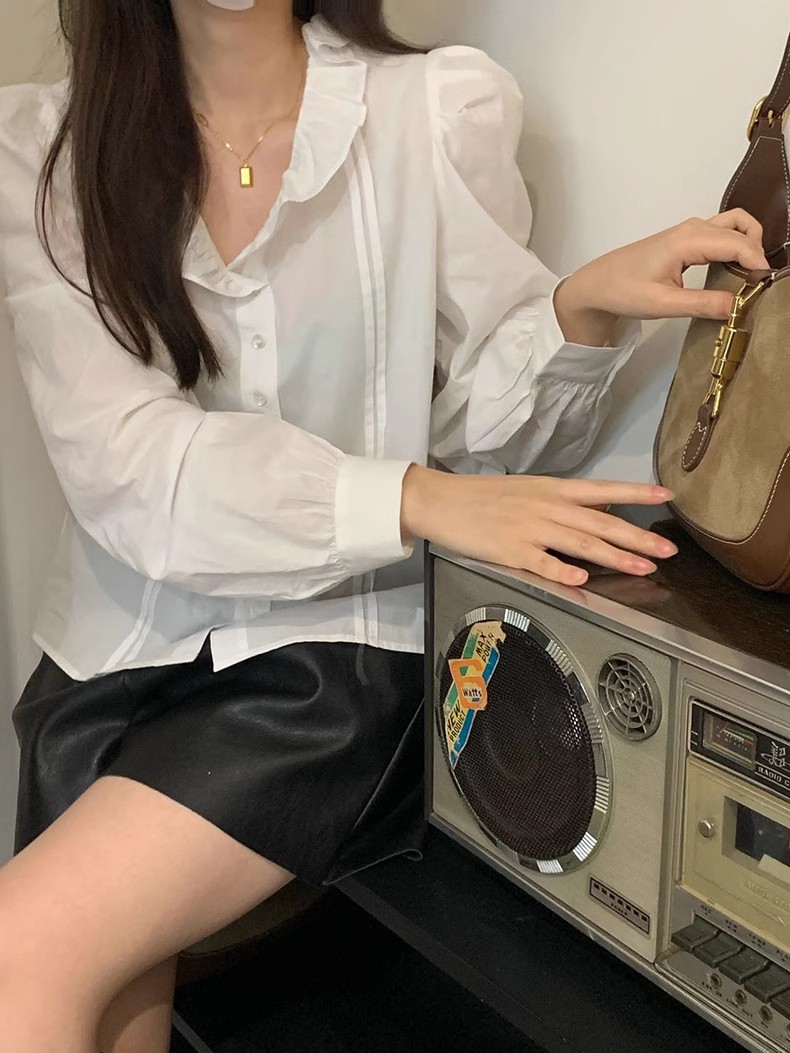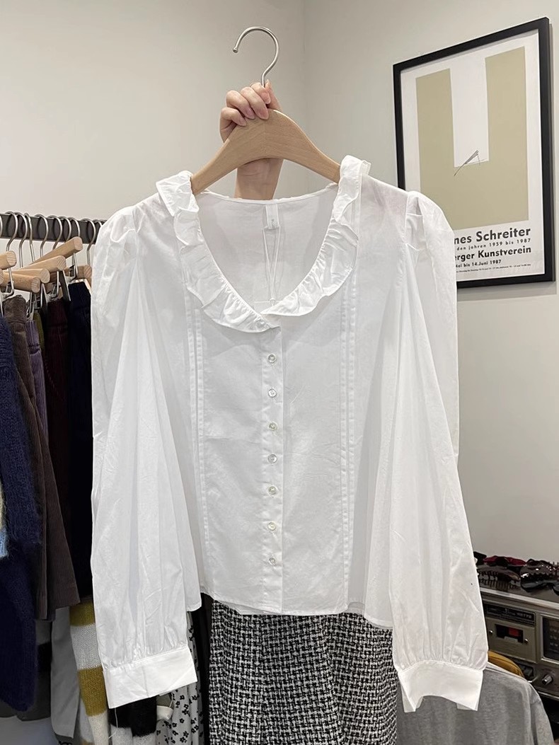 秋季新款小众设计感休闲纯棉白色衬衫荷叶边灯笼袖内搭上衣女