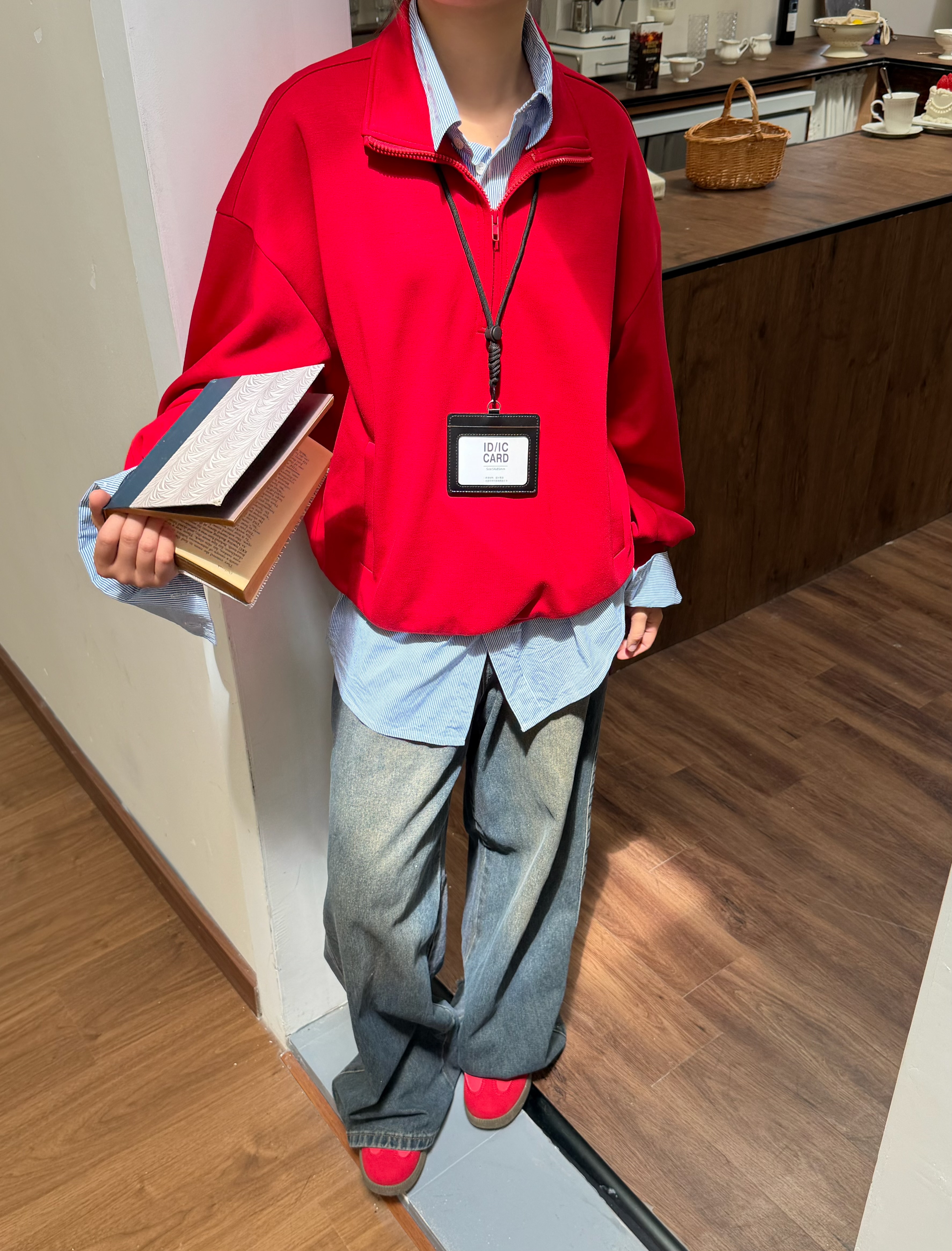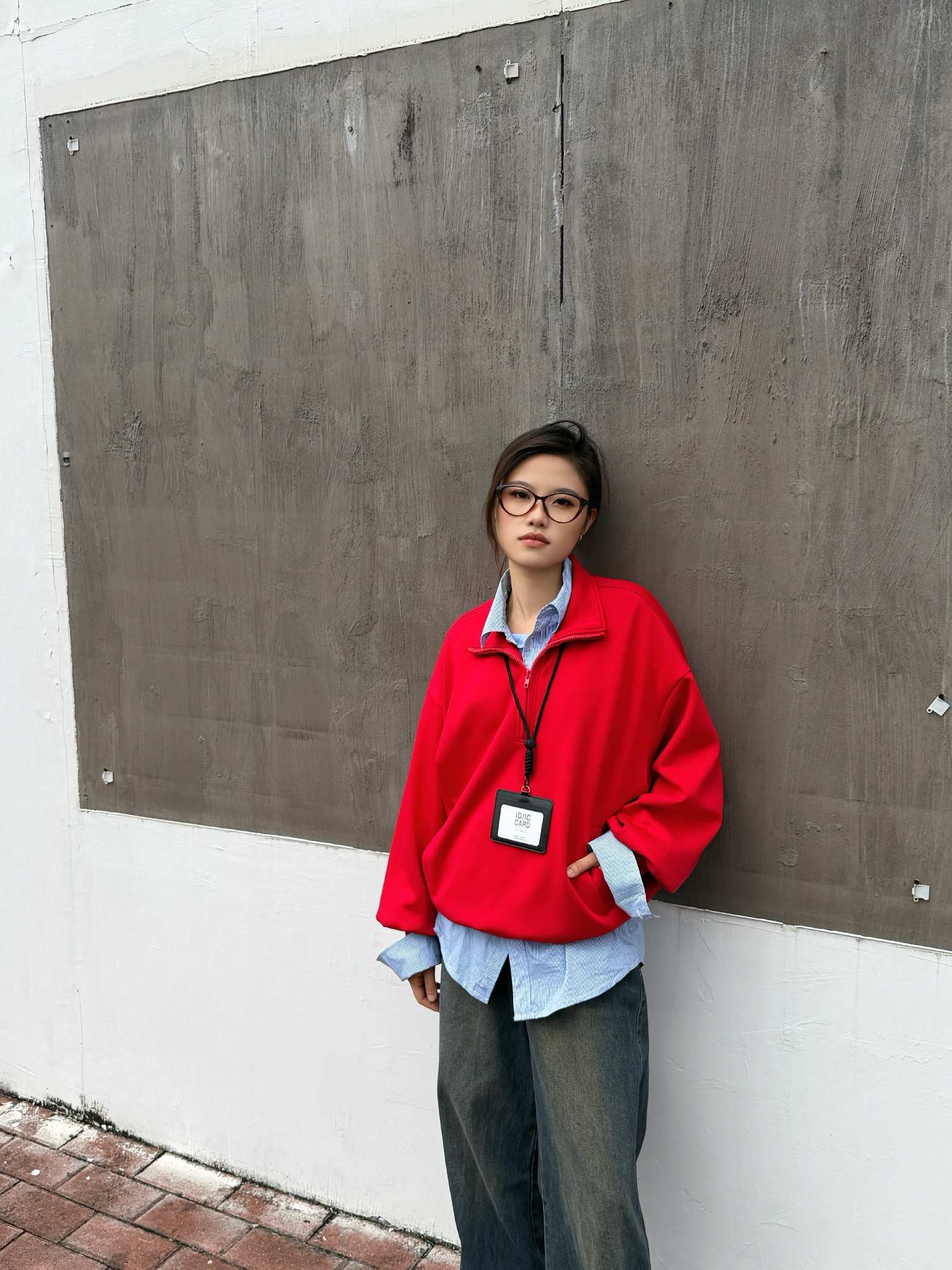 YIMEI韩版新年复古红色半拉链翻领卫衣女宽松慵懒风休闲百搭上衣