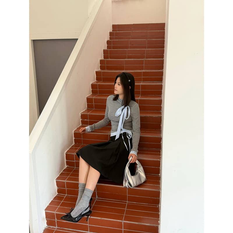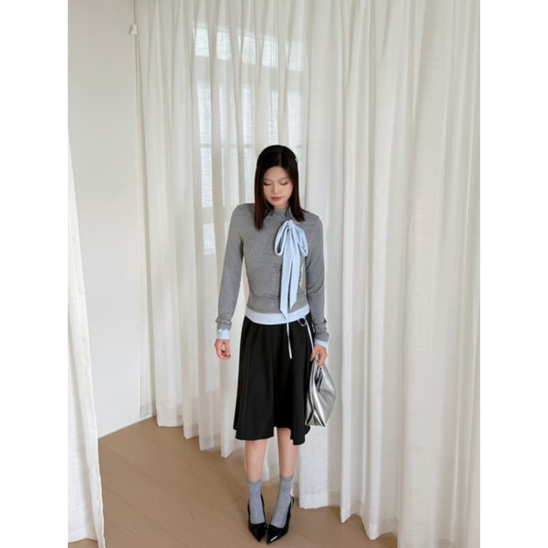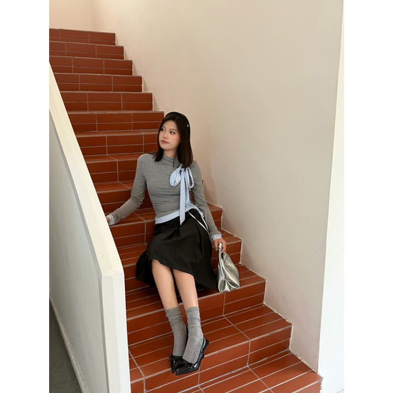 YIMEINIJIA假两件内搭长袖打底衫蝴蝶结上衣+百褶高腰半身裙套装